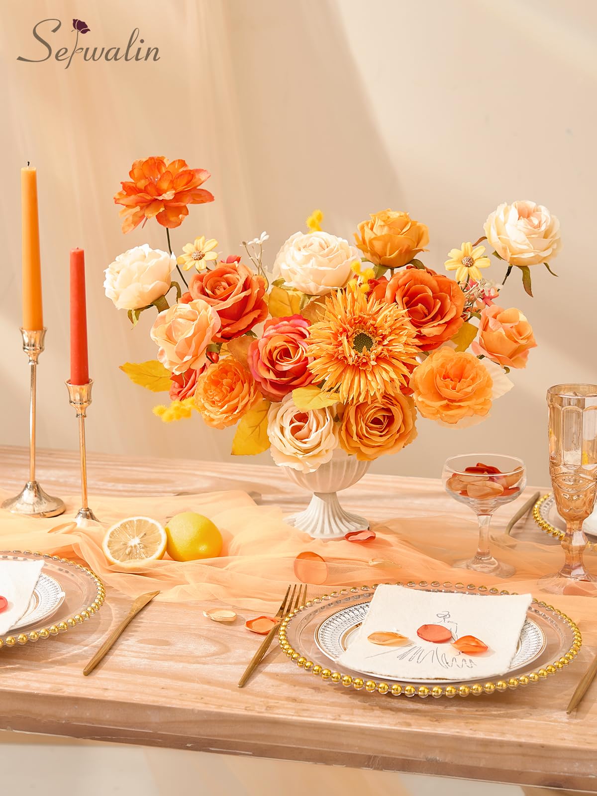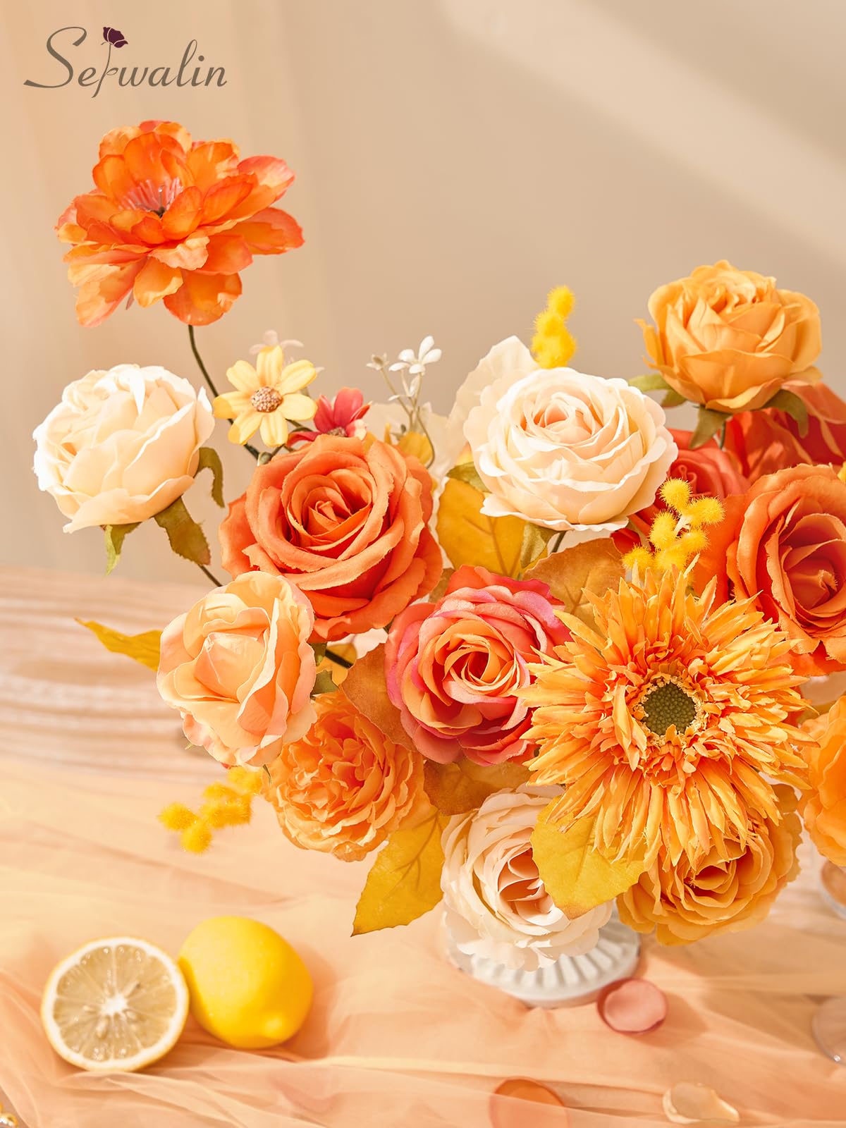 Artificial Flowers Design: This silk flowers is mainly bright warm orange, with a sunny vitality. The yellow flowers are embellished to add playfulness and cuteness, as if the sunshine is mixed into the flowers, lighting up the space and making feel relaxed
