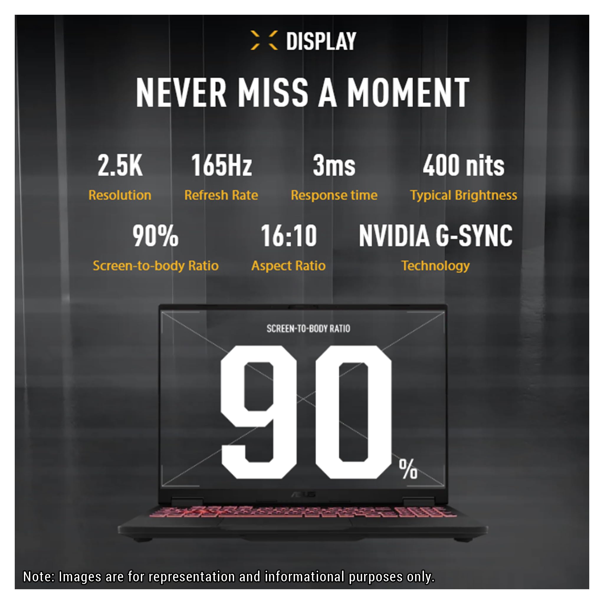 【Display】Immersive visuals with 16" 165Hz Display Keep up with the pros thanks to its FHD+ resolution, 165Hz display with NVIDIA G-SYNC. The 16:10 aspect ratio display, along with slim bezels and a 90% screen-to-body ratio, creates an incredibly immersive experience.