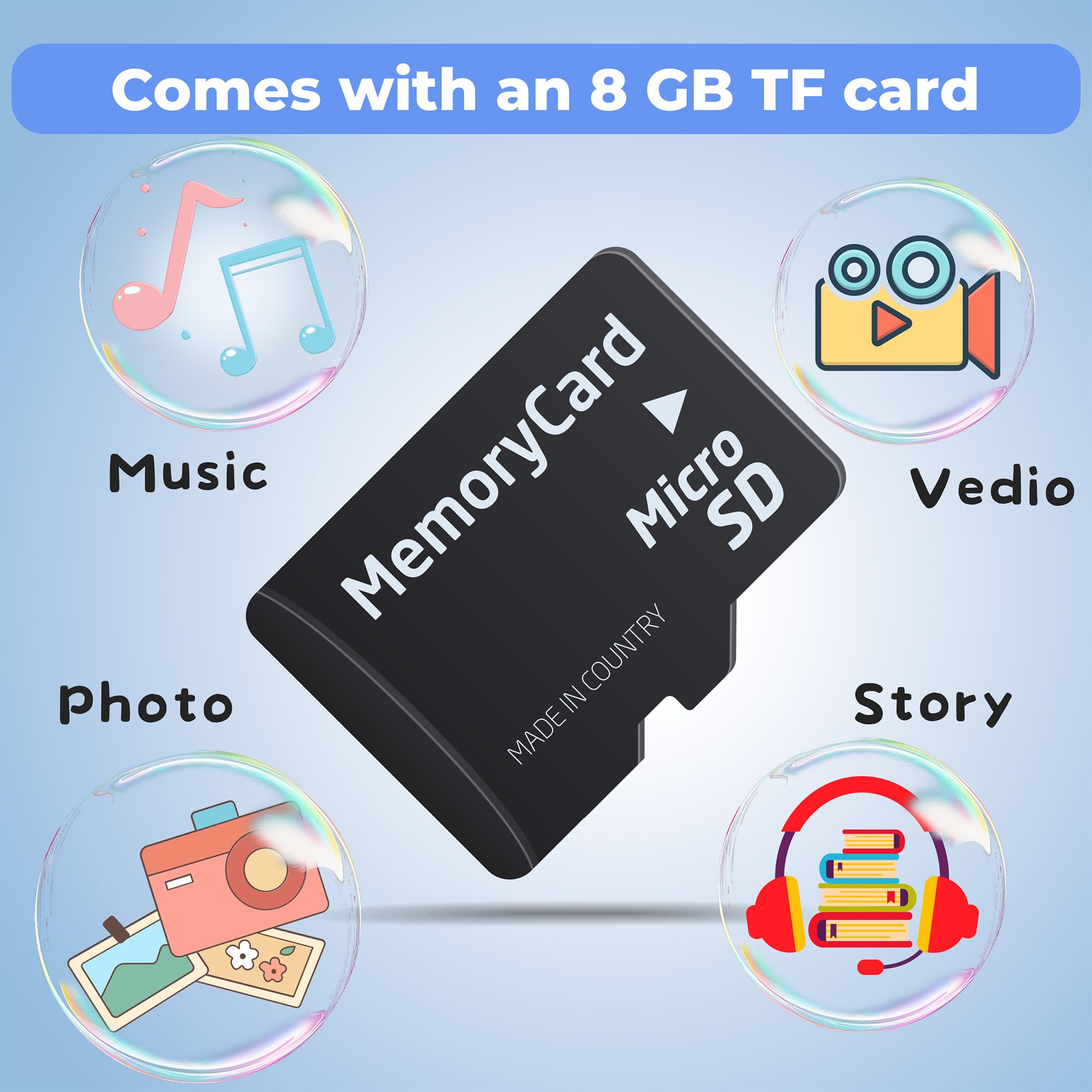 【8GB TF Card】: This kid watch includes an 8GB TF card, which has been pre-installed in the watch. You can add your desired music, audio stories, and videos for your child, and there is also more storage space available for your child to record their daily life