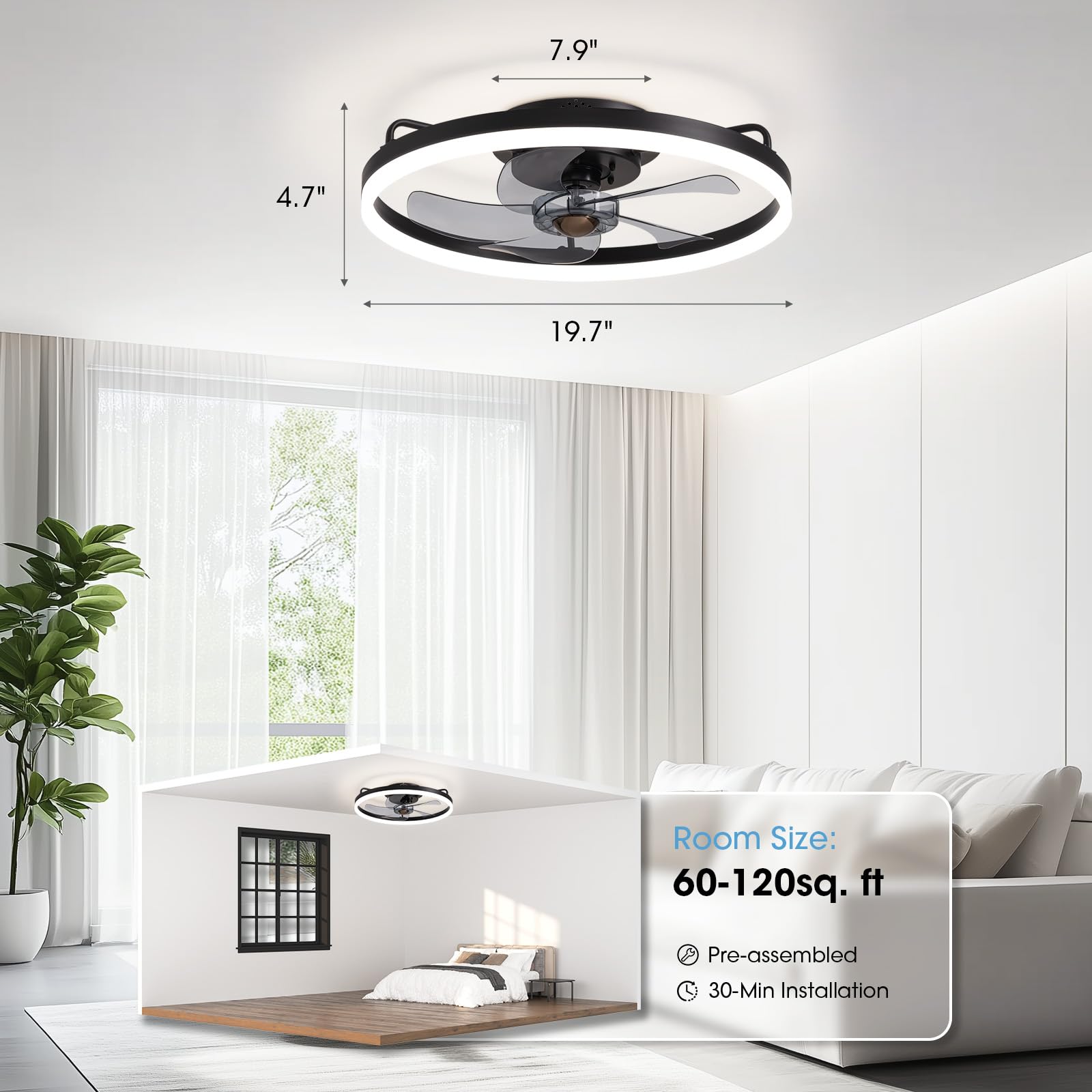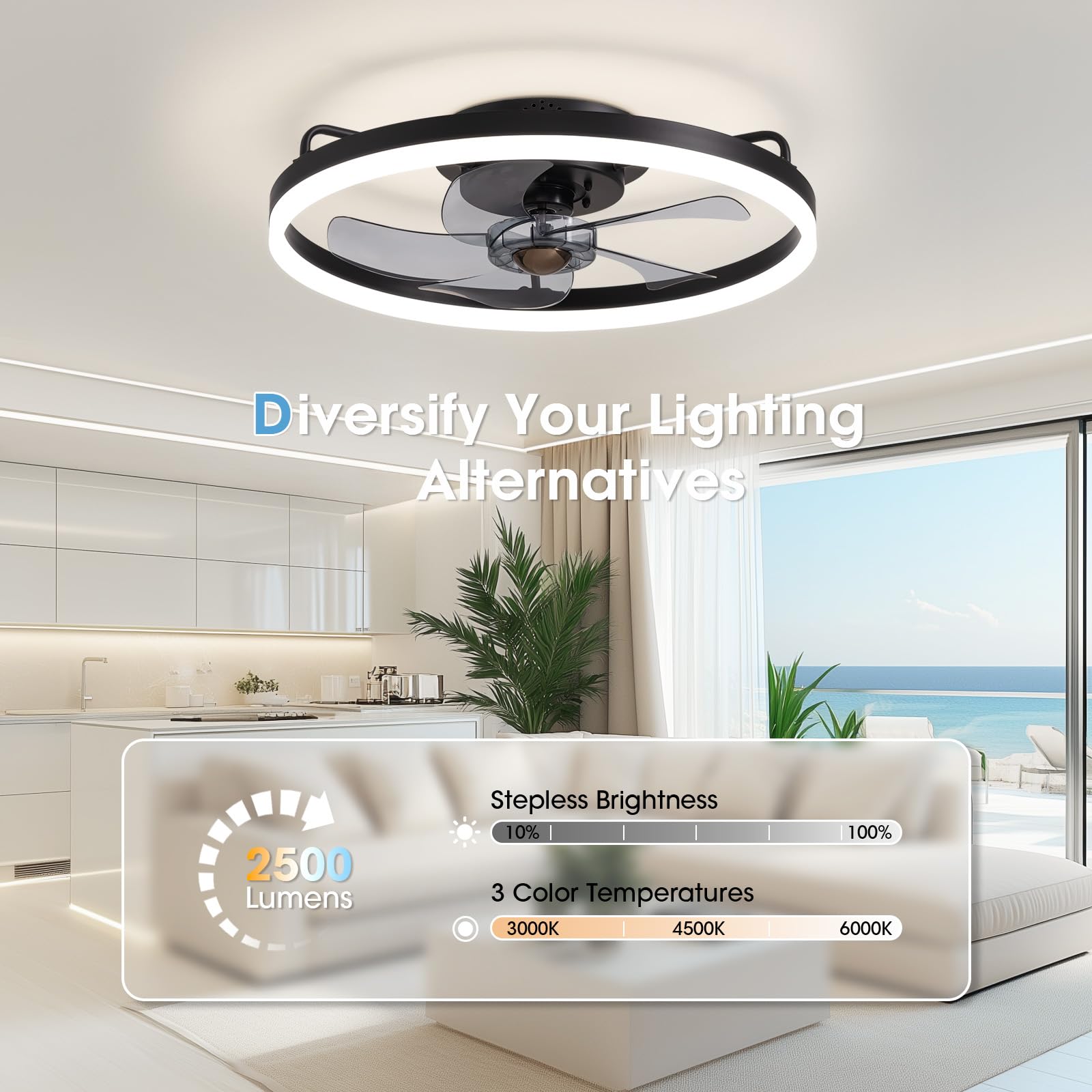 【Dimmable 34W LED Light】: This semi flush mount ceiling fan light has three color lighting modes that can be controlled by a remote / APP, ranging from warm (3000K) to white light (6500K). It is also dimmable, with a range of 10% to 100% brightness, allowing you to adjust the light from dark to bright.