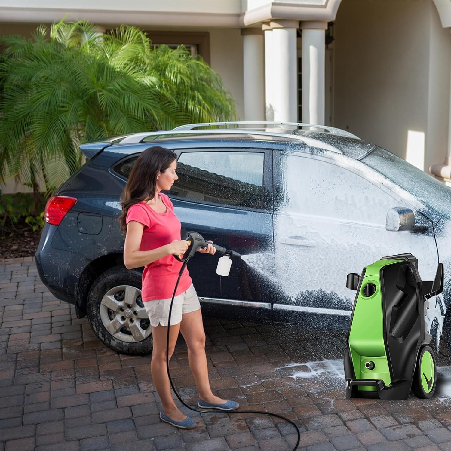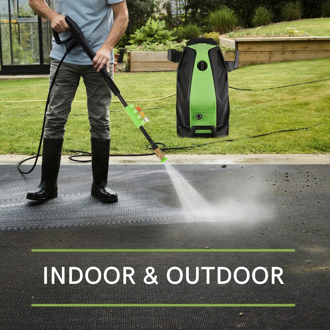 [Versatile Cleaning Solutions] Equipped with four universal quick-connect nozzles (0°, 15°, 25°, 40°), turbine nozzles, and an advanced 500ml foam gun, this pressure washer can address a wide array of cleaning tasks. Users can adjust the pressure settings to meet specific cleaning requirements. The foam cannon generates thick, dense foam, making it perfect for professional-grade car cleans and effectively cleaning even the dirtiest surfaces.