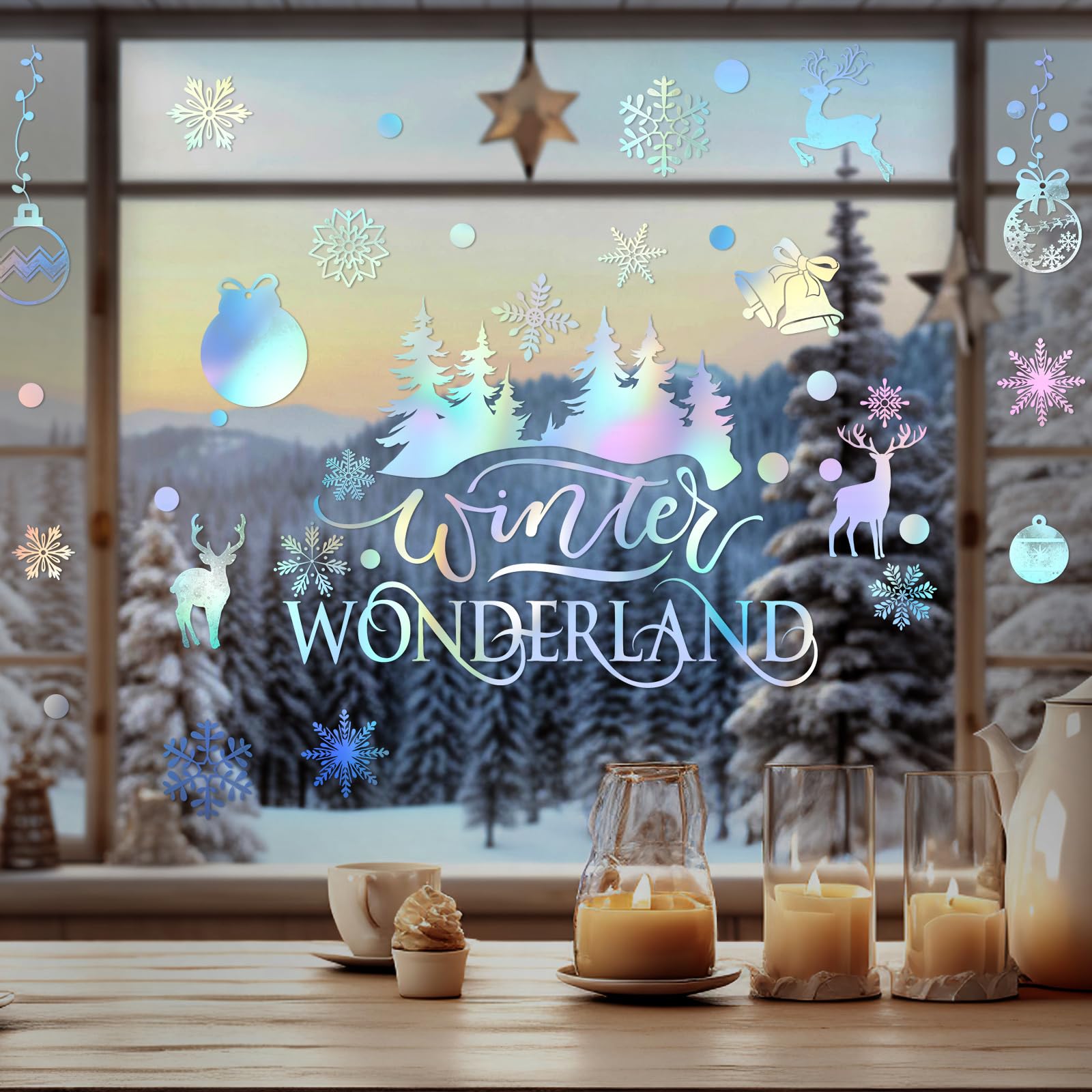 High quality material: winter wonderland window clings decal are made of non adhesive prismatic,durable PVC gel adsorption film,,which can be easily removed and pasted without leaving any residue on the glass, reusable; double-sided printing, bright and vivid color and pattern can be clearly seen through the window from both the outside and the inside, more eye-catching to the crowds