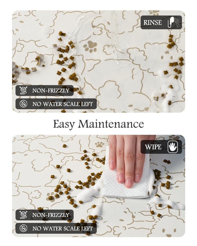 Keep Clean & No Stains:No marks will be left when food and water are dropped on the dog food mat. Unlike traditional silicone pet feeding mats, our pet feeding mat for food and water won't pick up pet hair or dust, and won't build up tough-to-clean limescale, keeping the dog bowl mat as good as new forever.