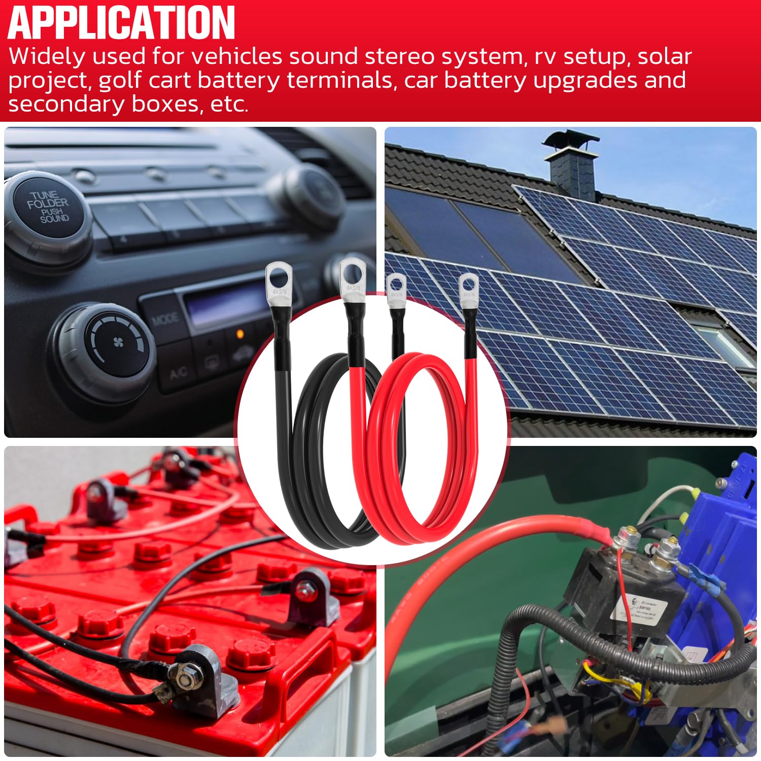 You can use these battery cables for replacement automotive, motorcycle, RV, camper, travel trailer and other vehicle wiring applications, grounding cables, golf carts, car audio stereo amplifiers, solar and many other DC applications Package included: 1 black+1 red cable Note: Please carefully chack all the product information to make sure this will fit your original unit Any questions, please tell us, we’ll answer you as quick as possible