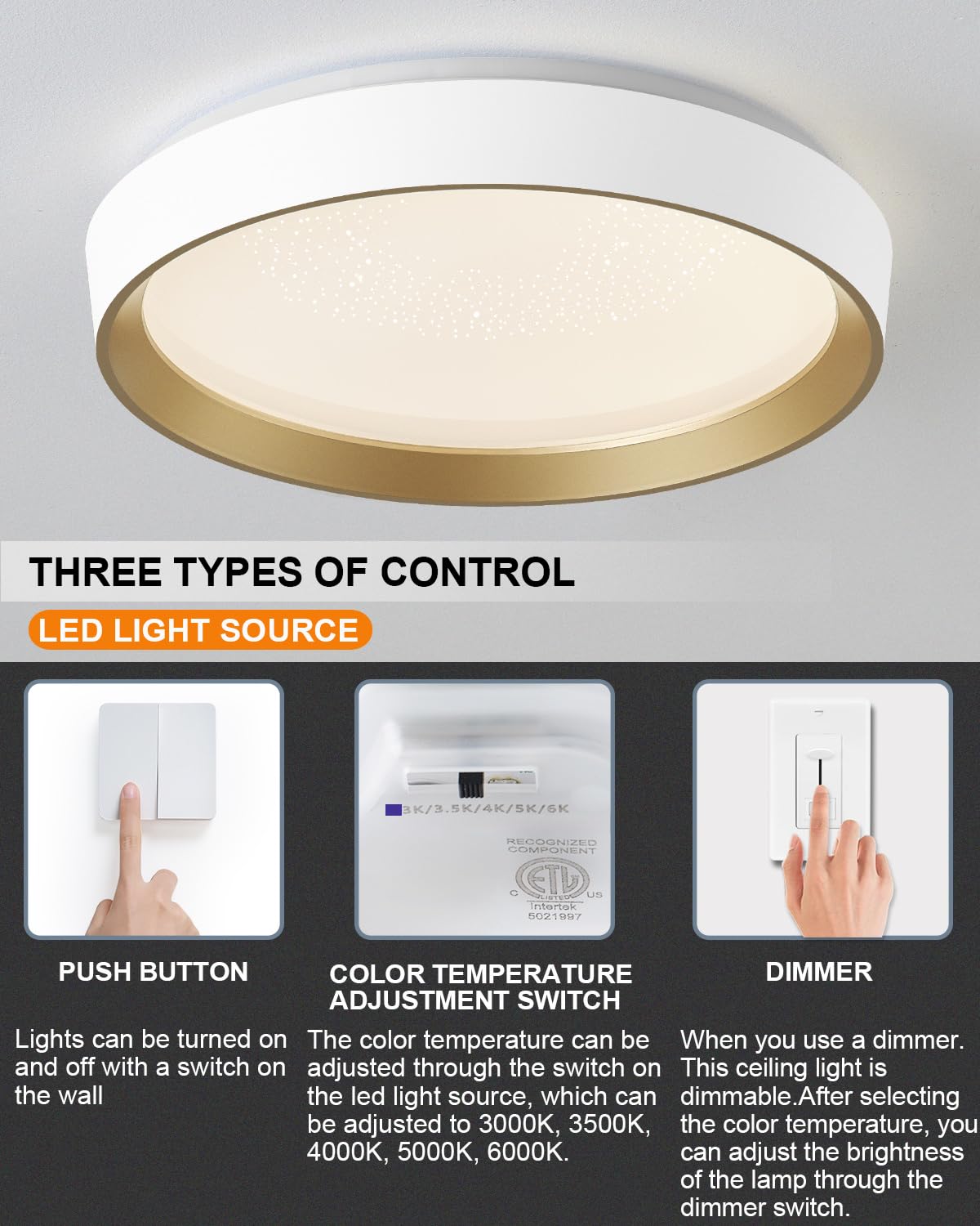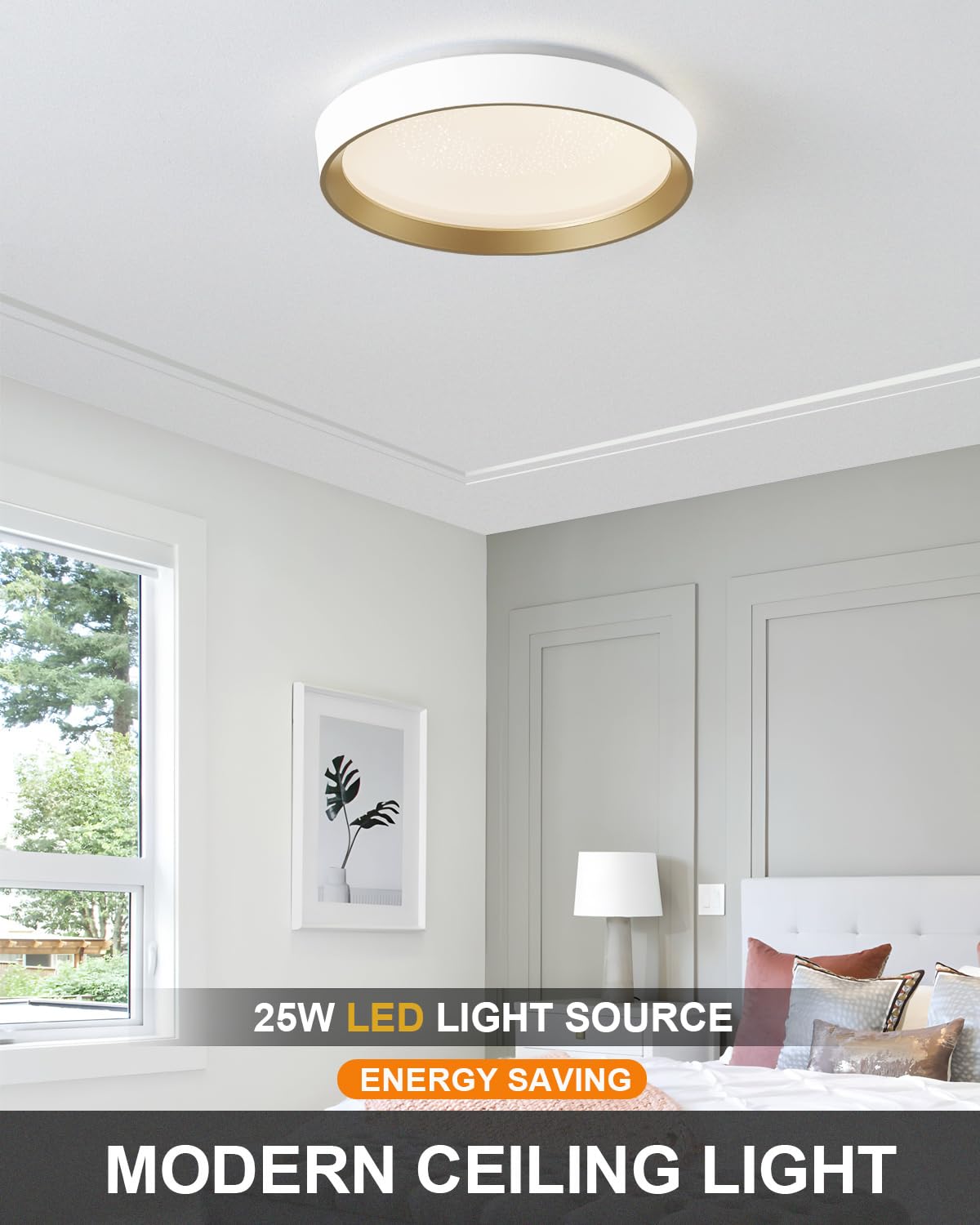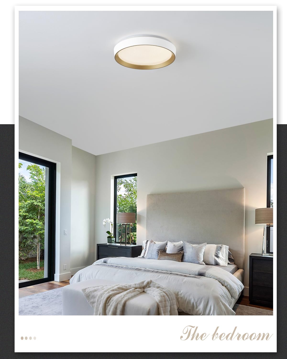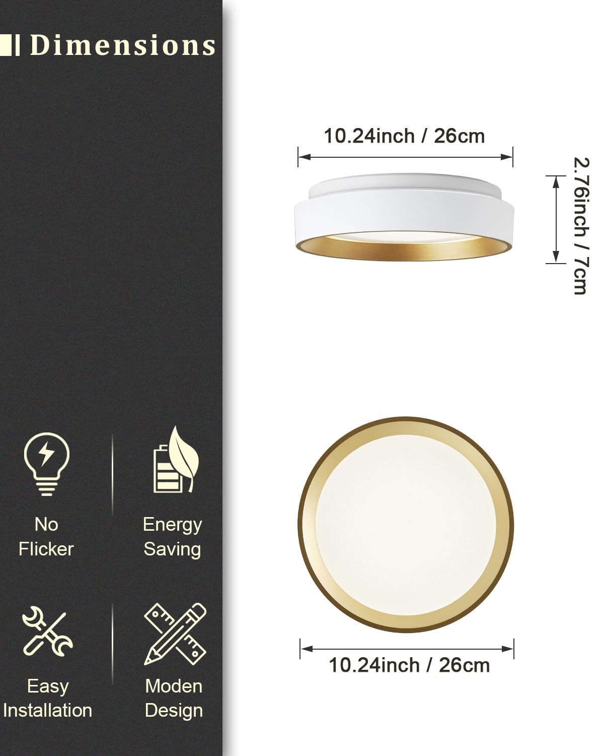 Elevate your home lighting with this modern 10-inch LED ceiling lamp, featuring a sleek White and gold design that adds a touch of elegance to any space. Equipped with high-performance LED chips, it delivers 2400 lumens of bright, energy-efficient light using only 24W. Enjoy customizable lighting with five color temperatures (3000K/3500K/4000K/5000K/6000K) and smooth 10–100% stepless dimming. ETL certified for safety, this flush mount light offers flicker-free, glare-free illumination for optimal eye comfort. Installation is quick and easy with included hardware. Ideal for bedrooms, living rooms, kitchens, hallways, and more, it brings both style and function to your home