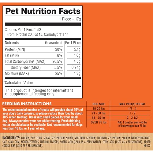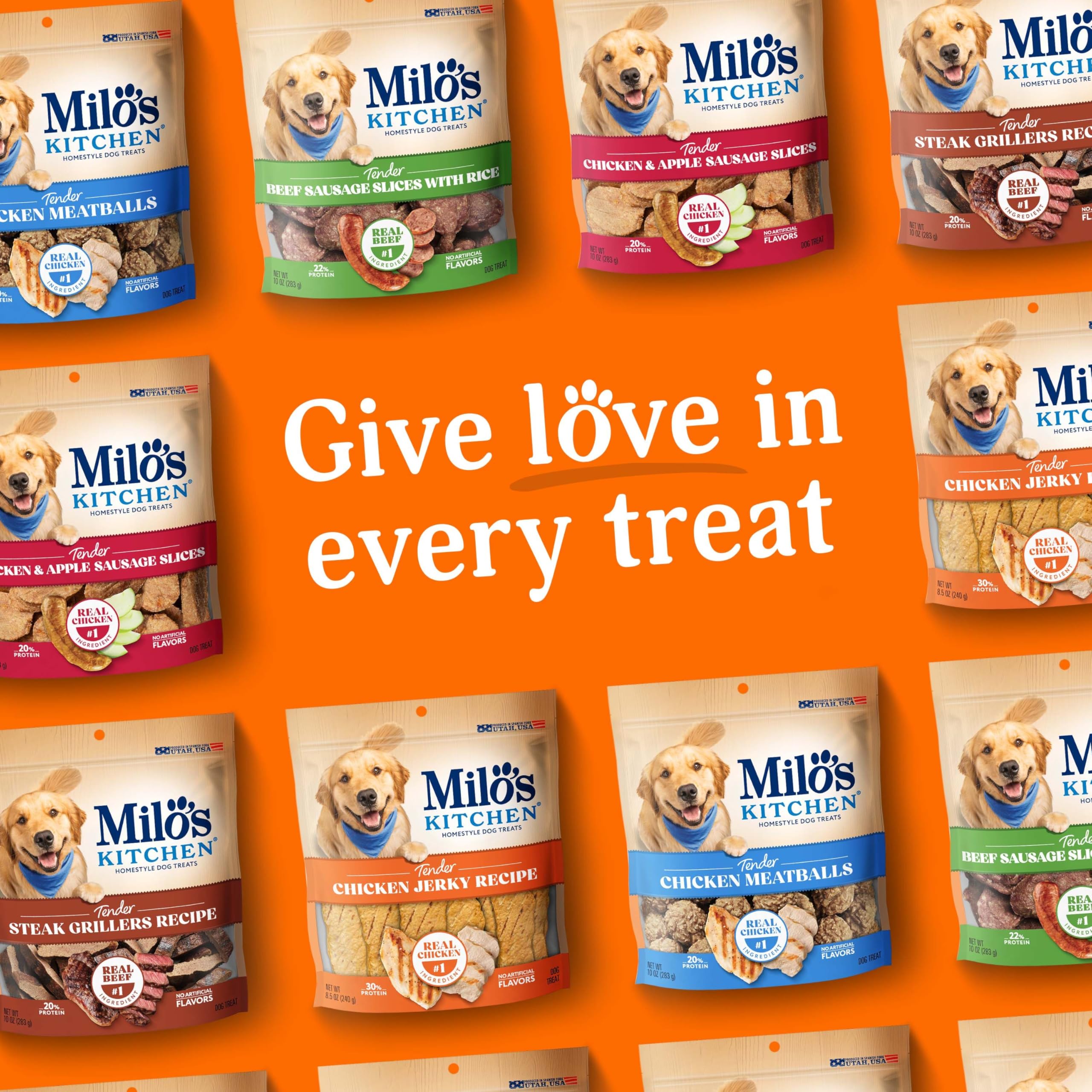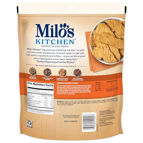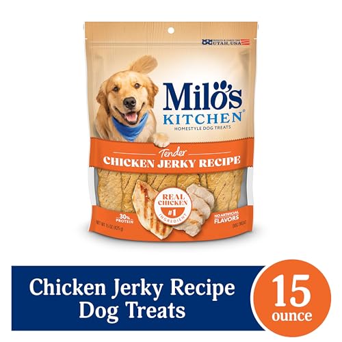 Contains one (1) 15-oz. bag of Milo’s Kitchen Chicken Jerky Recipe dog treats