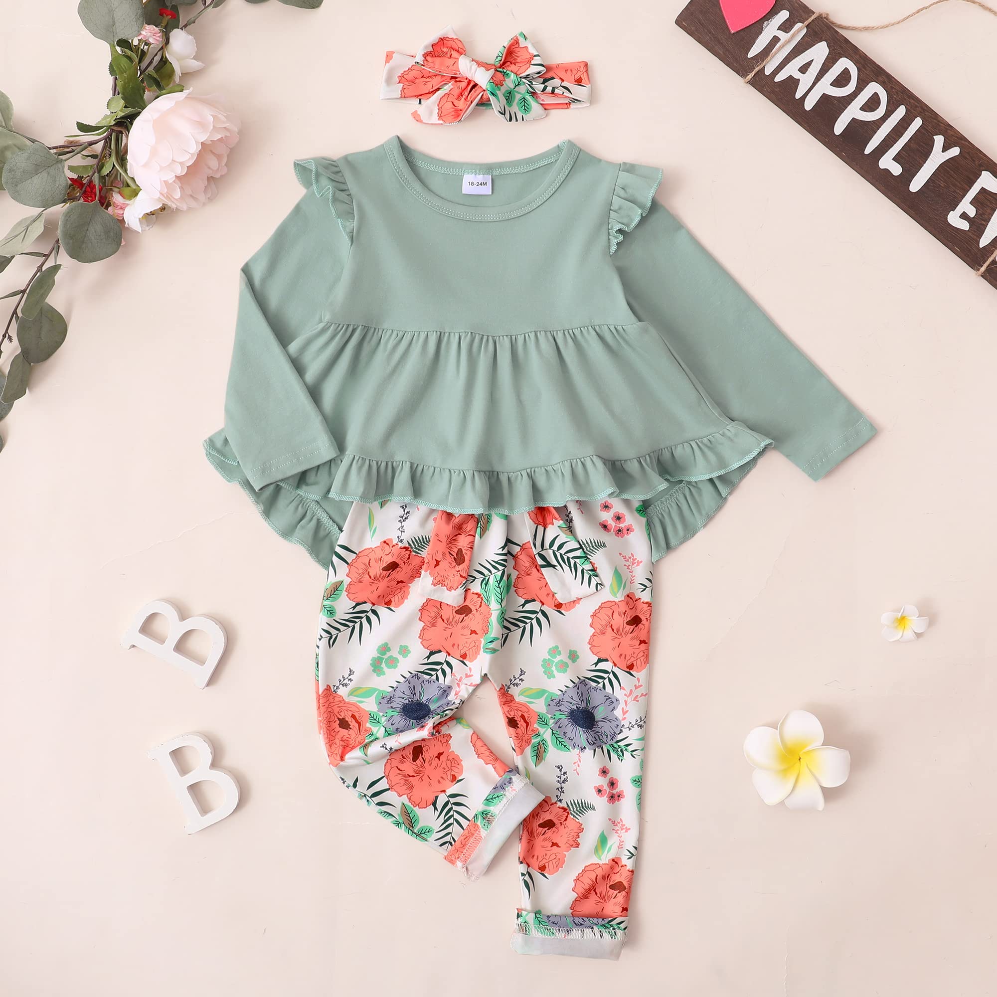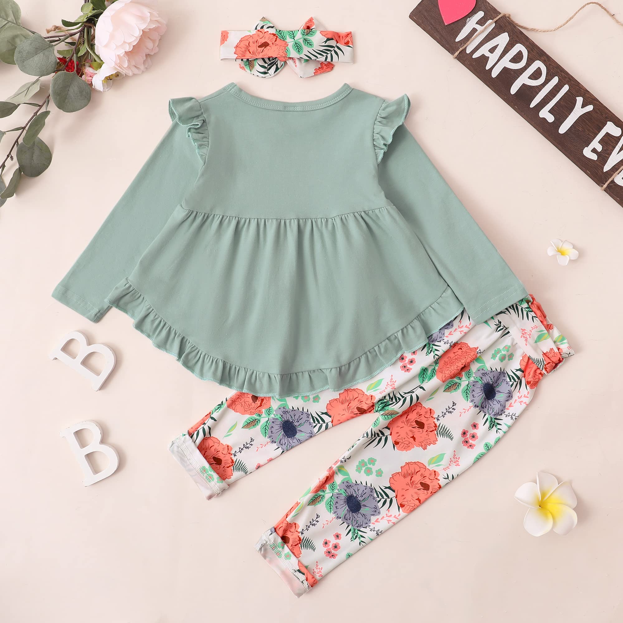 3 Pieces Toddler Little Girl Outift for Fall Winter: 1pc baby girl shirt + 1pc baby girl pants + 1pc untied headband