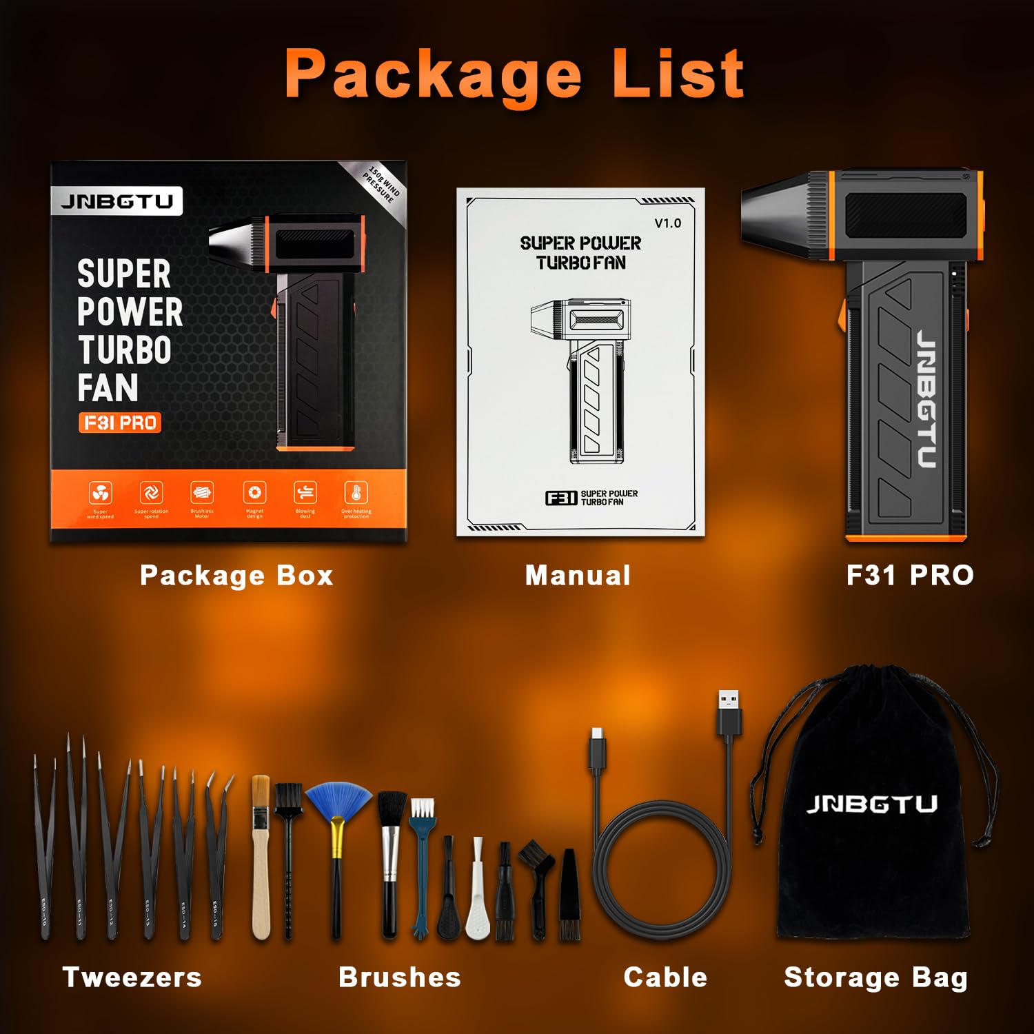 Accessories: JNBGTU compressed air dust collector includes USB Type-C data cable, instruction manual, storage bag and 16 accessories. We recommend using a 5V2A power adapter. For safe use, avoid overcharging and do not place near heat sources or combustible materials. If you have any questions about the use of the product, please contact us and we will resolve it for you within 24 hours