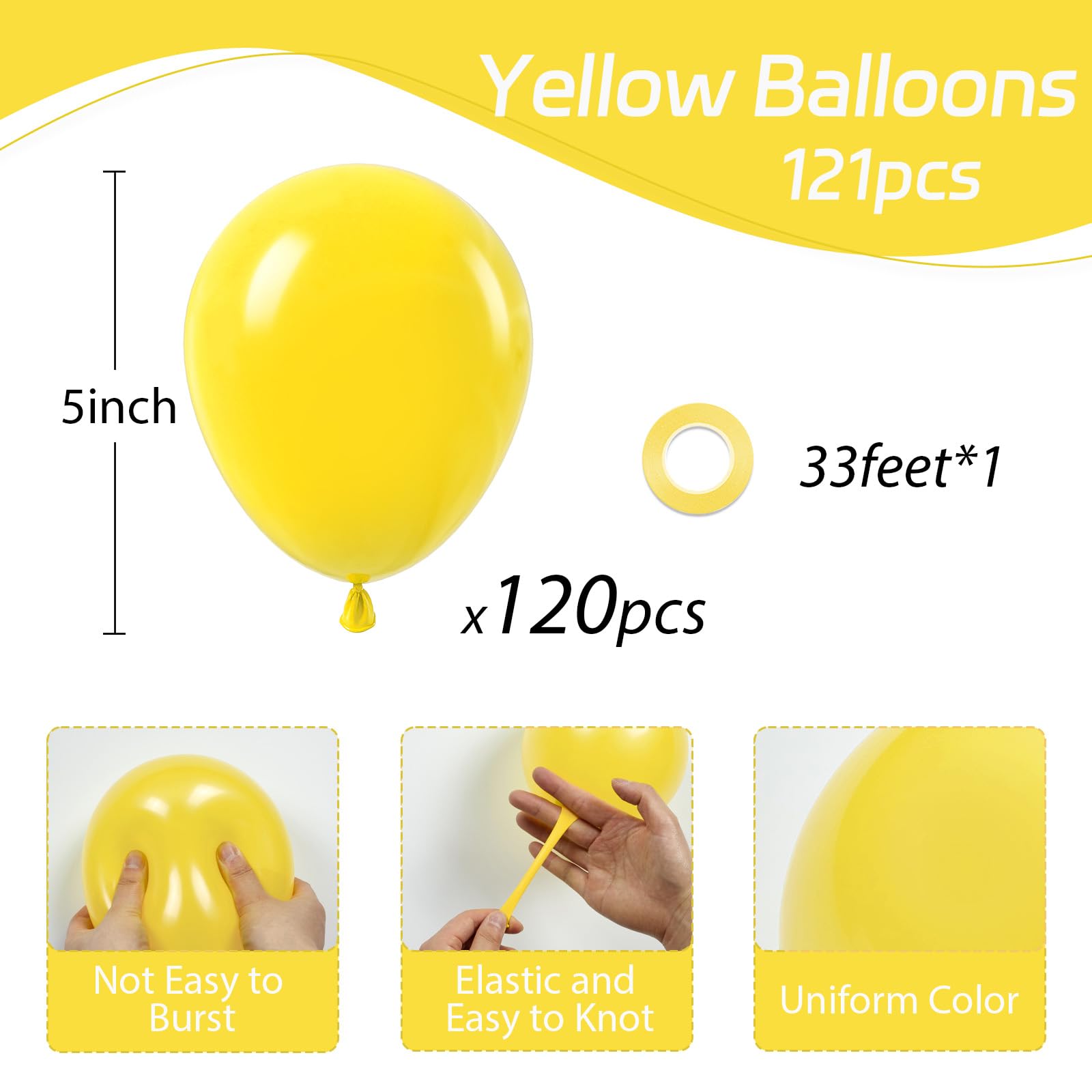 Package Include: The package include 120pack 5 inch yellow balloons and a roll of 33 feet yellow ribbon