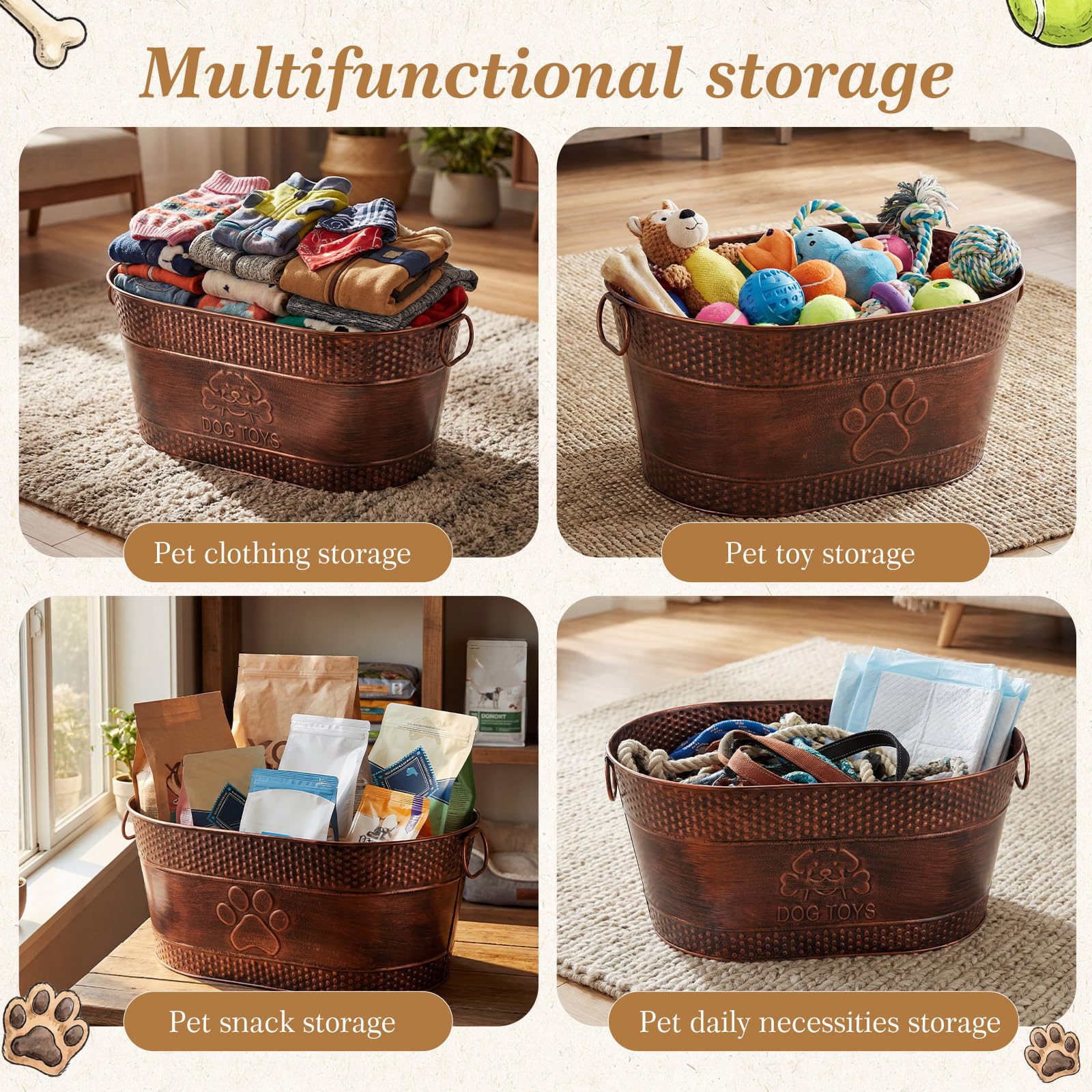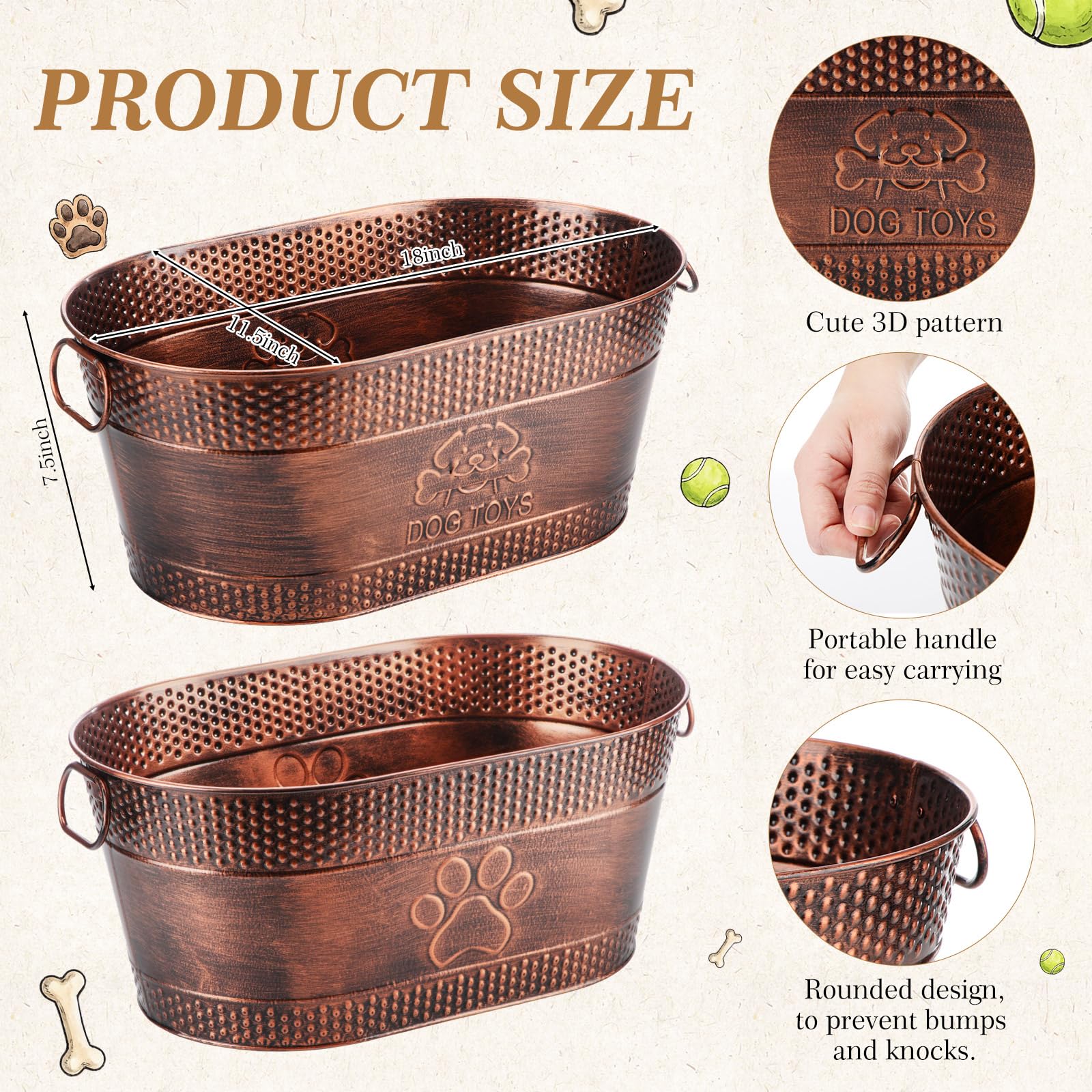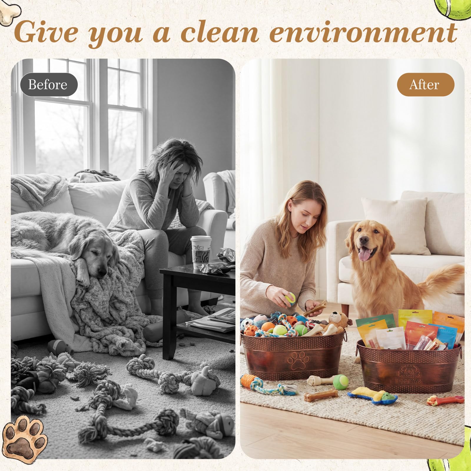 2 Pack Metal Dog Toy Baskets for Flexible Storage: our dog toy basket large set includes 2 oval copper dog toy baskets with different embossed designs—a dog bone and a paw. Perfect for organizing toys, blankets, and leashes in multiple rooms while keeping your home tidy and stylish