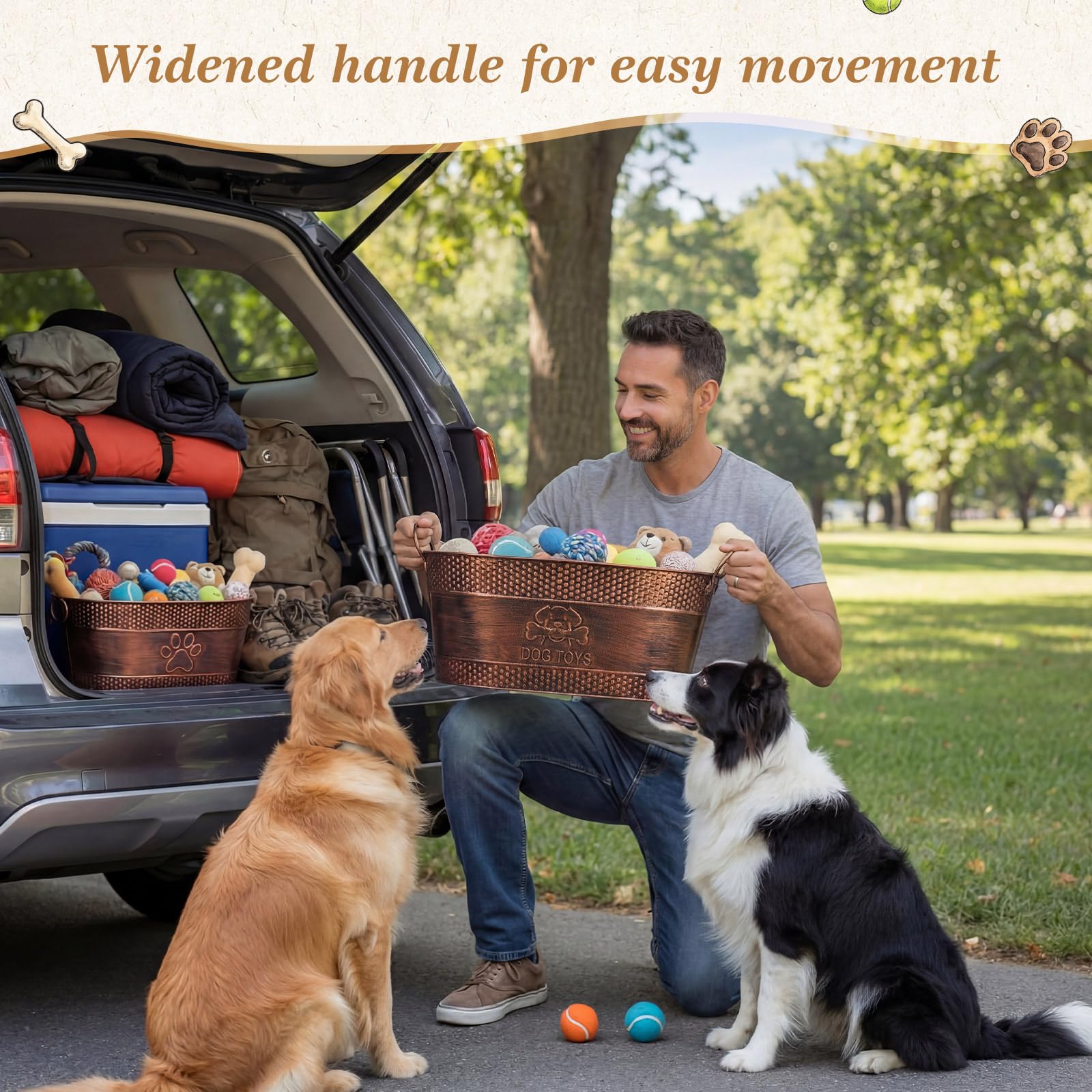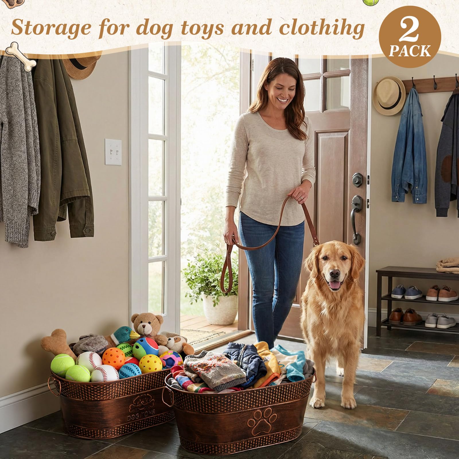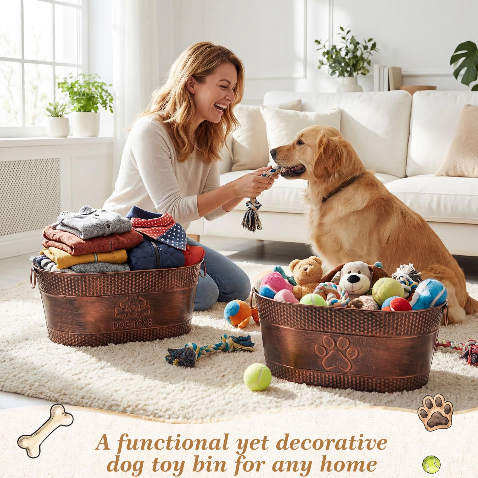 2 Pack Metal Dog Toy Baskets for Flexible Storage: our dog toy basket large set includes 2 oval copper dog toy baskets with different embossed designs—a dog bone and a paw. Perfect for organizing toys, blankets, and leashes in multiple rooms while keeping your home tidy and stylish