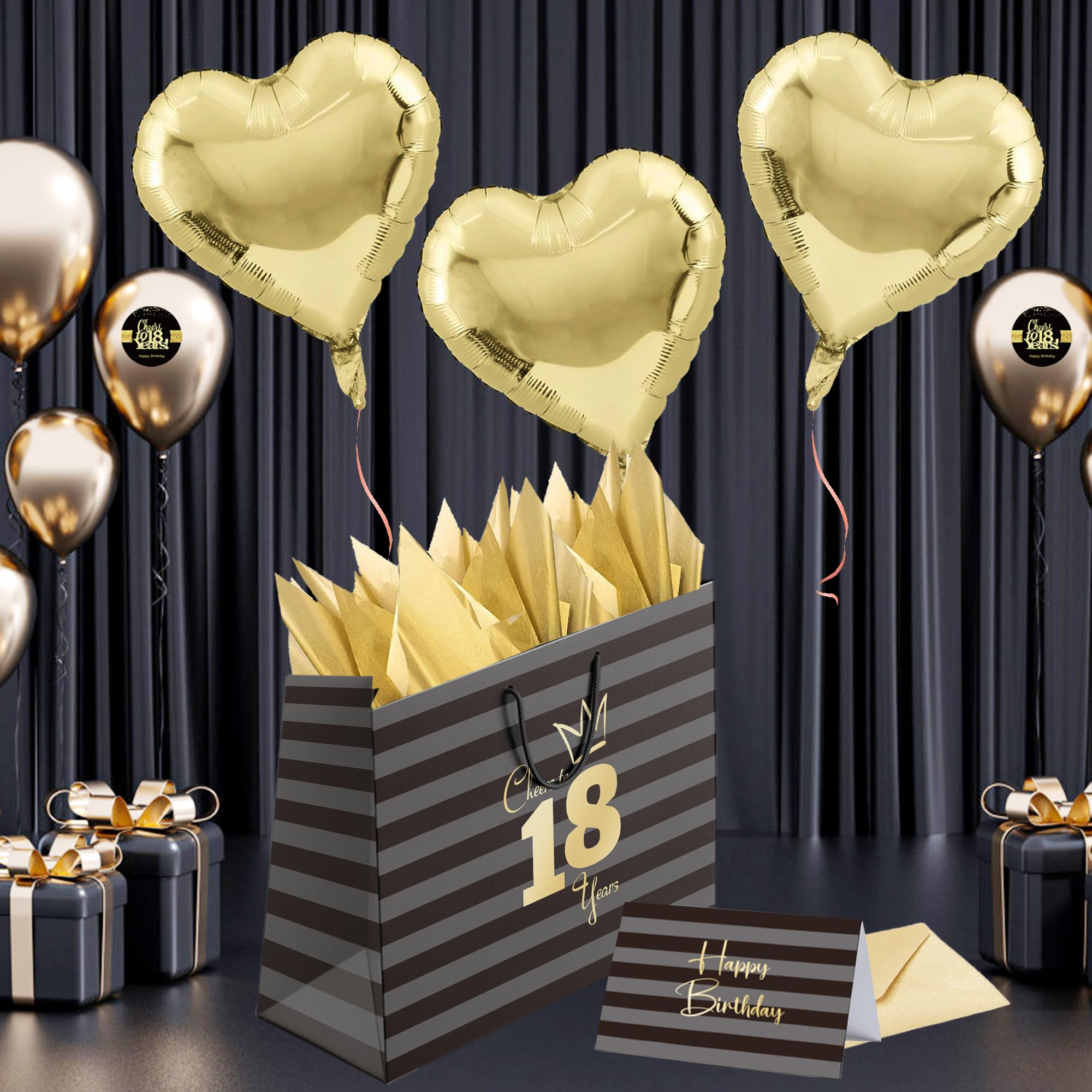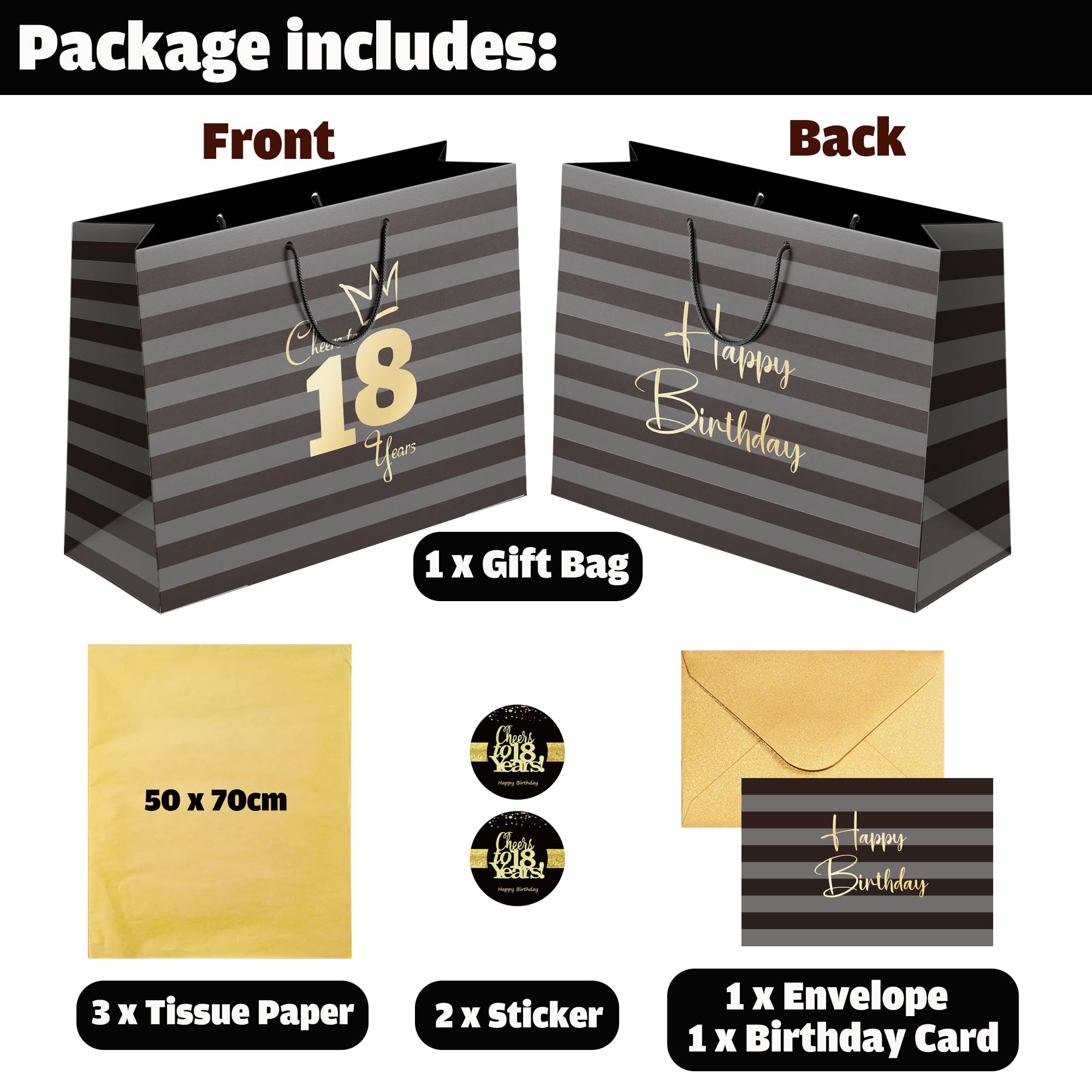 【18th Birthday Bag for Women】: The black and gray striped gift bag reads "Cheers to 18 years" and "Happy Birthday"!