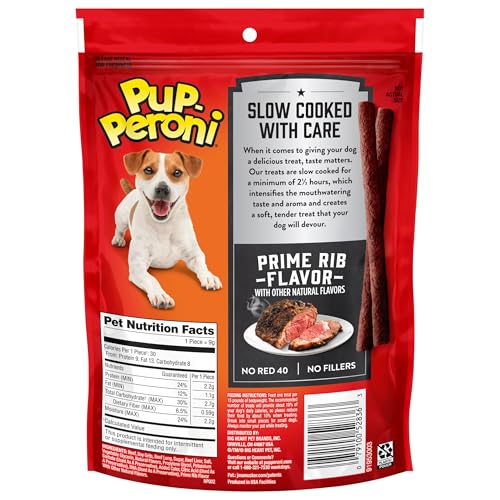 Make your dog’s day with Pup-Peroni Prime Rib Flavor dog snacks. Real beef is the number one ingredient, so your dog gets delicious, high-quality protein in every bite. And if that’s not enough to excite ’em — Pup-Peroni slow cooks their dog treats for at least 2.5 hours, which helps retain moisture and intensifies the taste and aroma. The result? An irresistibly rich, meaty treat with a soft, tender texture dogs can sink their teeth into. It’s everything your dog wants in a treat … and yet, nothing you don’t. No fillers. No Red 40. Just the crazy-good soft dog treats your dog craves. Pick up a bag today!