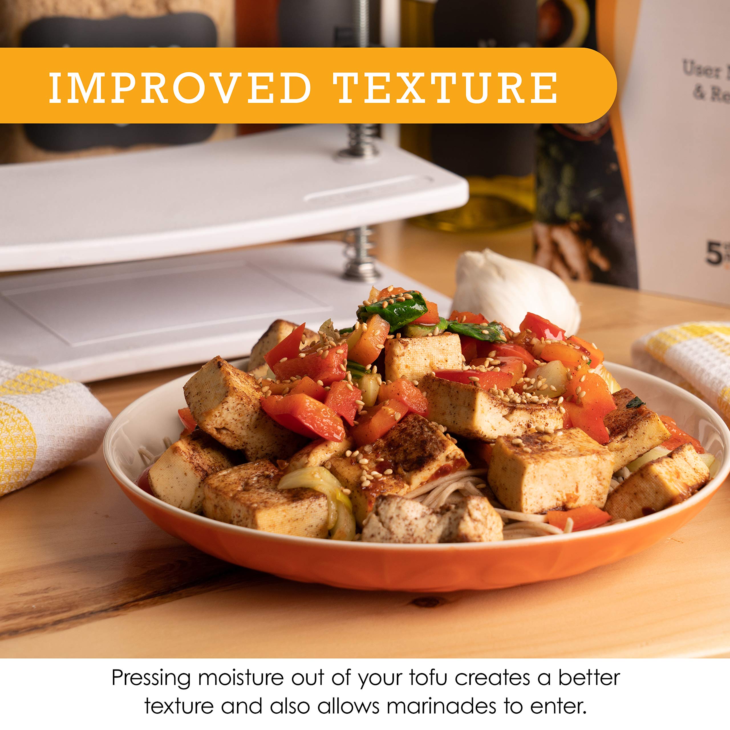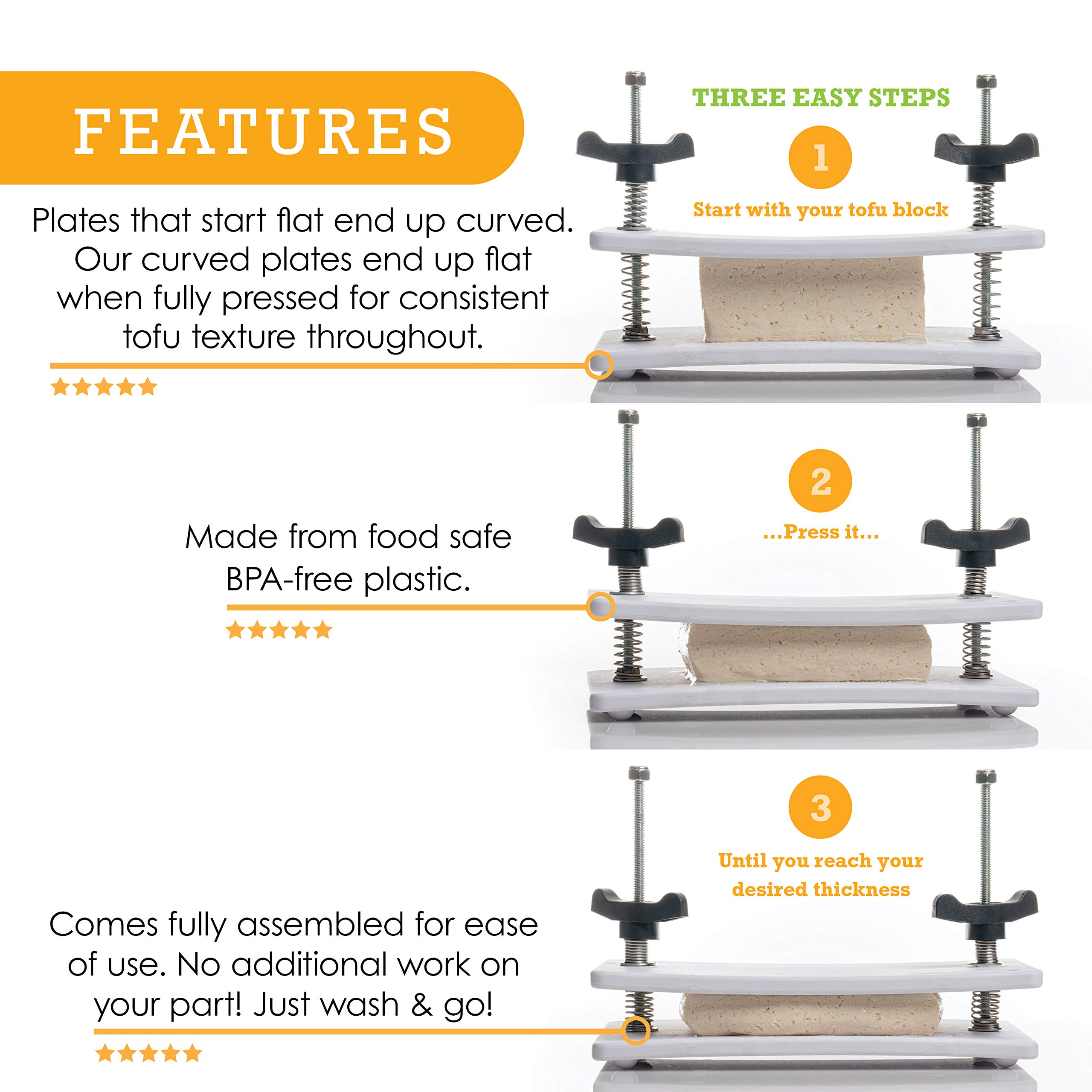 Innovative Curved Plate Design in a Tofu Press, Dishwasher Safe and BPA-Free: Unlike flat plates that bulge, our tofu press features solid plastic curved plates that straighten as you press, giving you perfectly even, extra firm tofu.