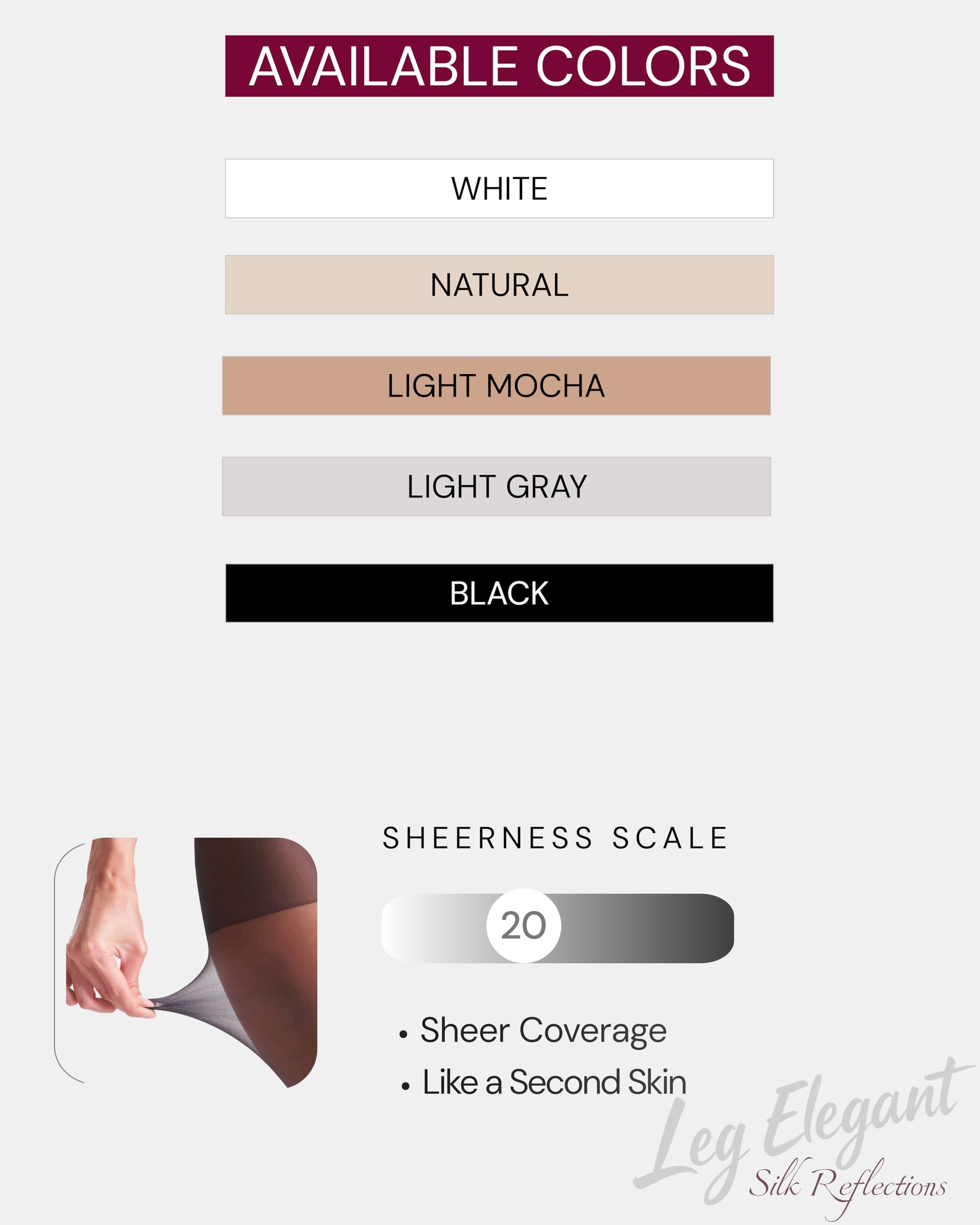 Nude-Natural: Healthy medium skin tone (a deeper, sun-warmed shade, not a pale nude); Black: (Sheer semi-transparent black with subtle coverage); Light Mocha: a warm, muted brown shade that resembles the color of a mousse mocha. It offers a natural sun-kissed appearance that enhances medium to tanned skin tones; Light Gray: (Soft sheer gray for sleek office elegance); White (Crisp White ideal for bridal wear or creating a flawless, porcelain-skin effect.)