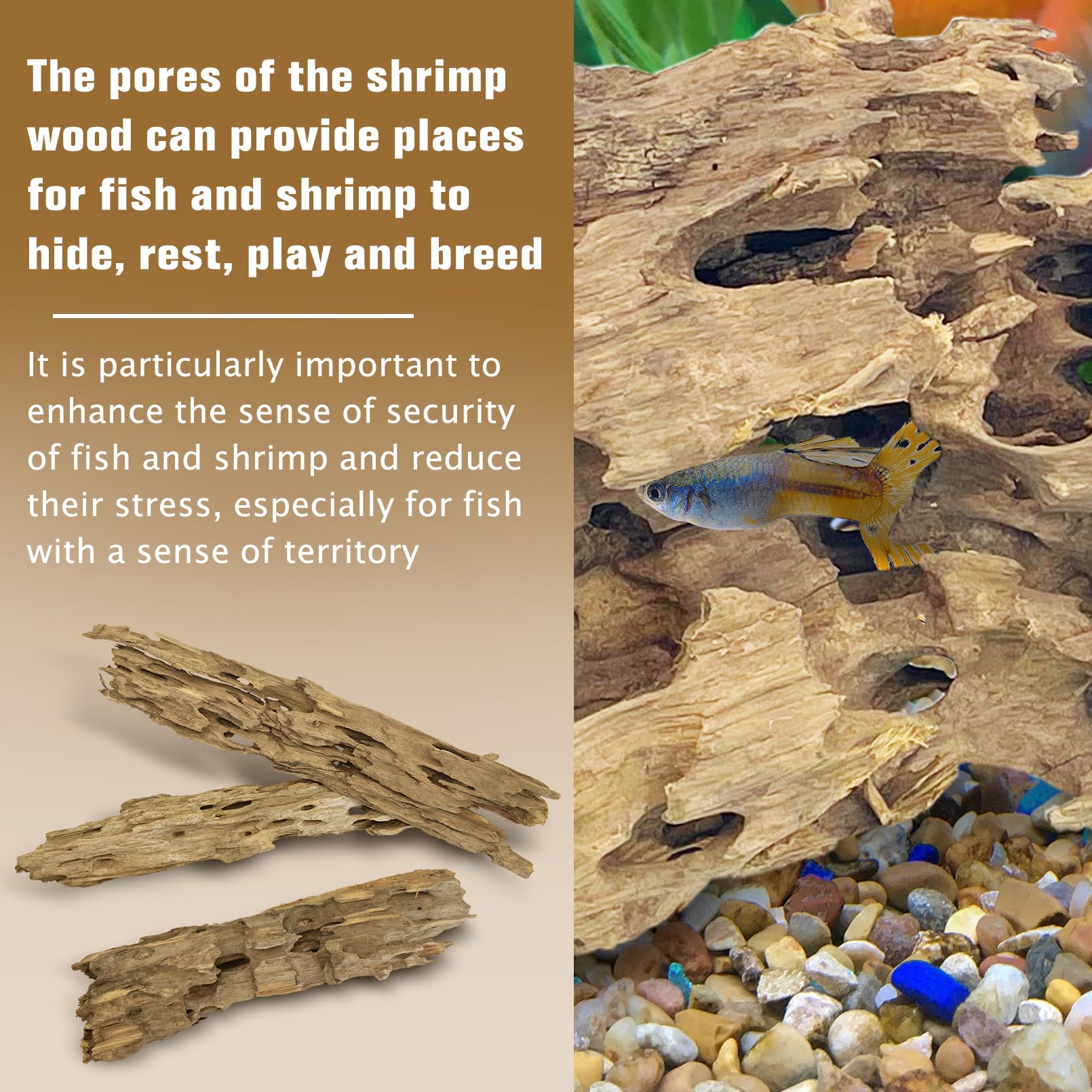 100% Natural wood: Made of 100% natural large driftwood, each piece has a unique shape. Interesting small fish driftwood with holes can be safe for your fish to hide, making your fish tank look more lively and cute