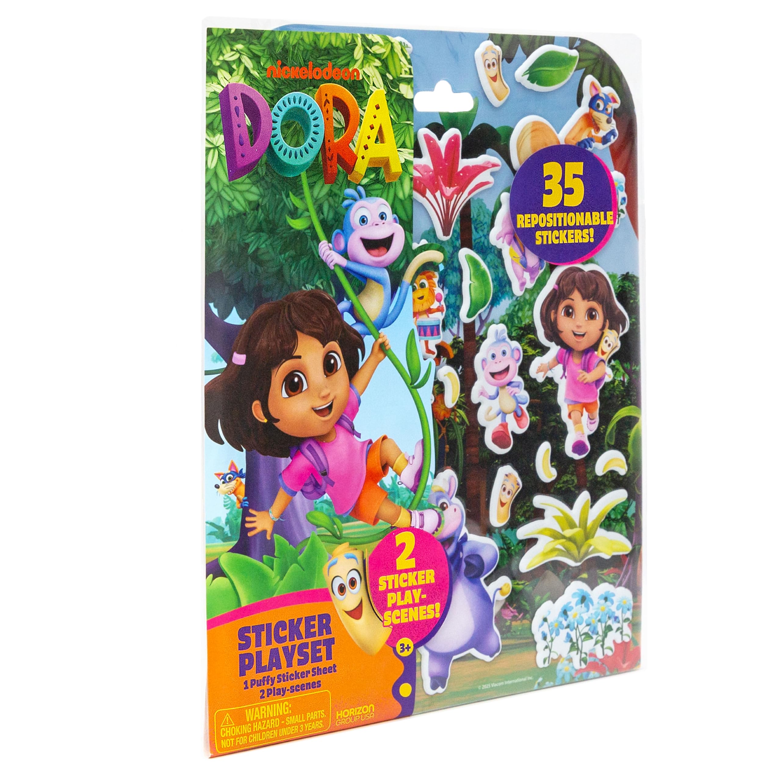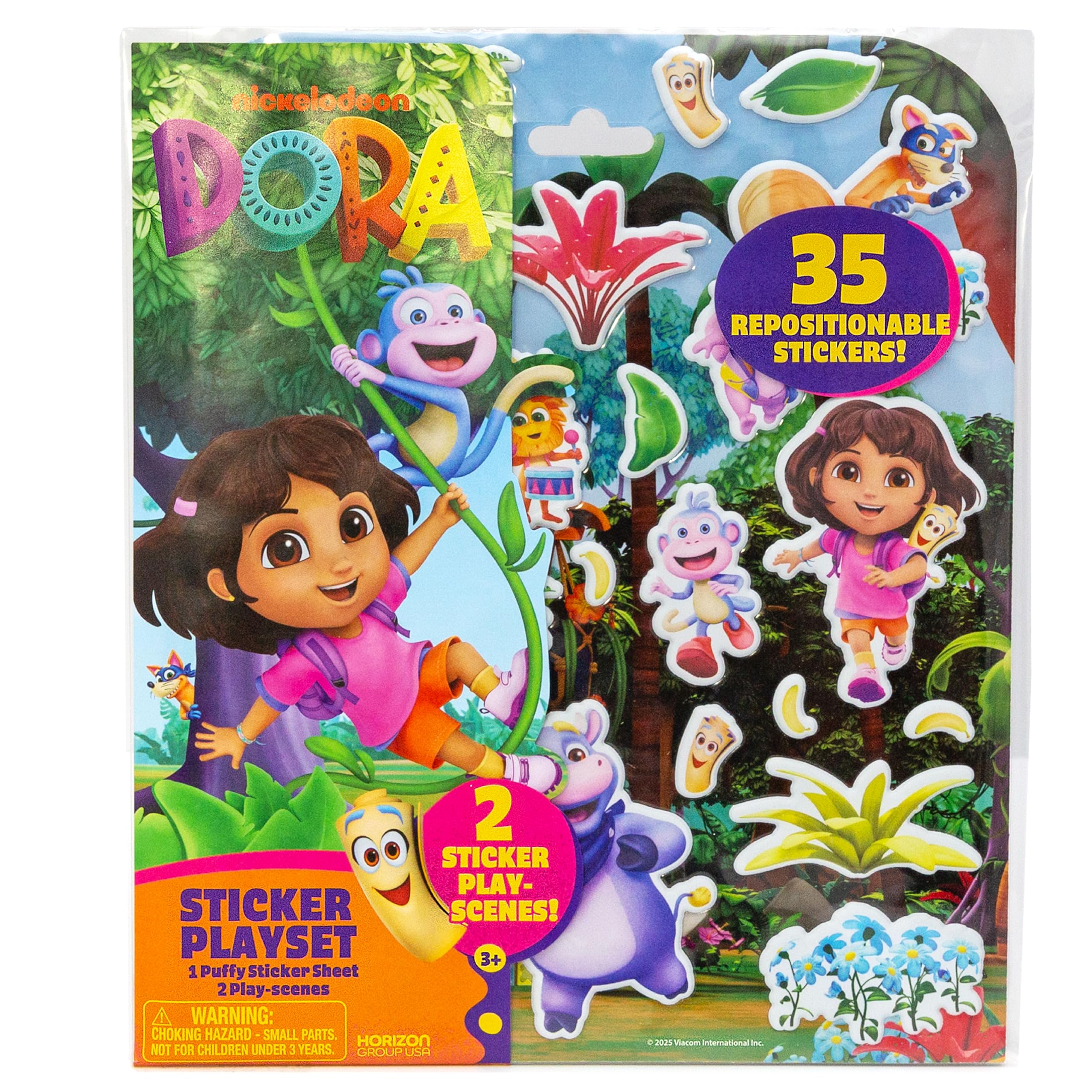 Adventure awaits with the Dora Puffy Sticker Playset! Featuring over 35 squishy, repositionable stickers of all your favorite amigos like Dora, Boots, Backpack and Map, along with bananas, flowers, and plants, you can create colorful stories again and again! The double-sided play scene folds out to reveal Dora’s yellow casita and Tico’s workshop in the Nutty Forest — the perfect backdrop for endless sticker adventures! Great for encouraging creativity and self-expression, this playset is a mess-free, toddler travel essential they can enjoy anywhere and anytime. Whether you are using Map to catch Swiper or celebrating with the Fiesta Trio, this portable playset is a portal into Dora’s world — ¡Buenísimo! Recommended for anyone age 3 and up.