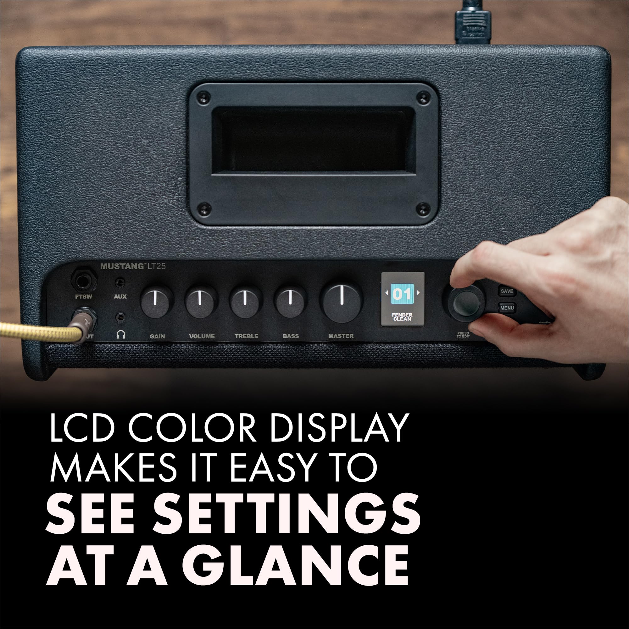 The Fender Mustang LT25 Guitar Amplifier features 25 watts, 12.75Hx14.5Wx8.25D inches