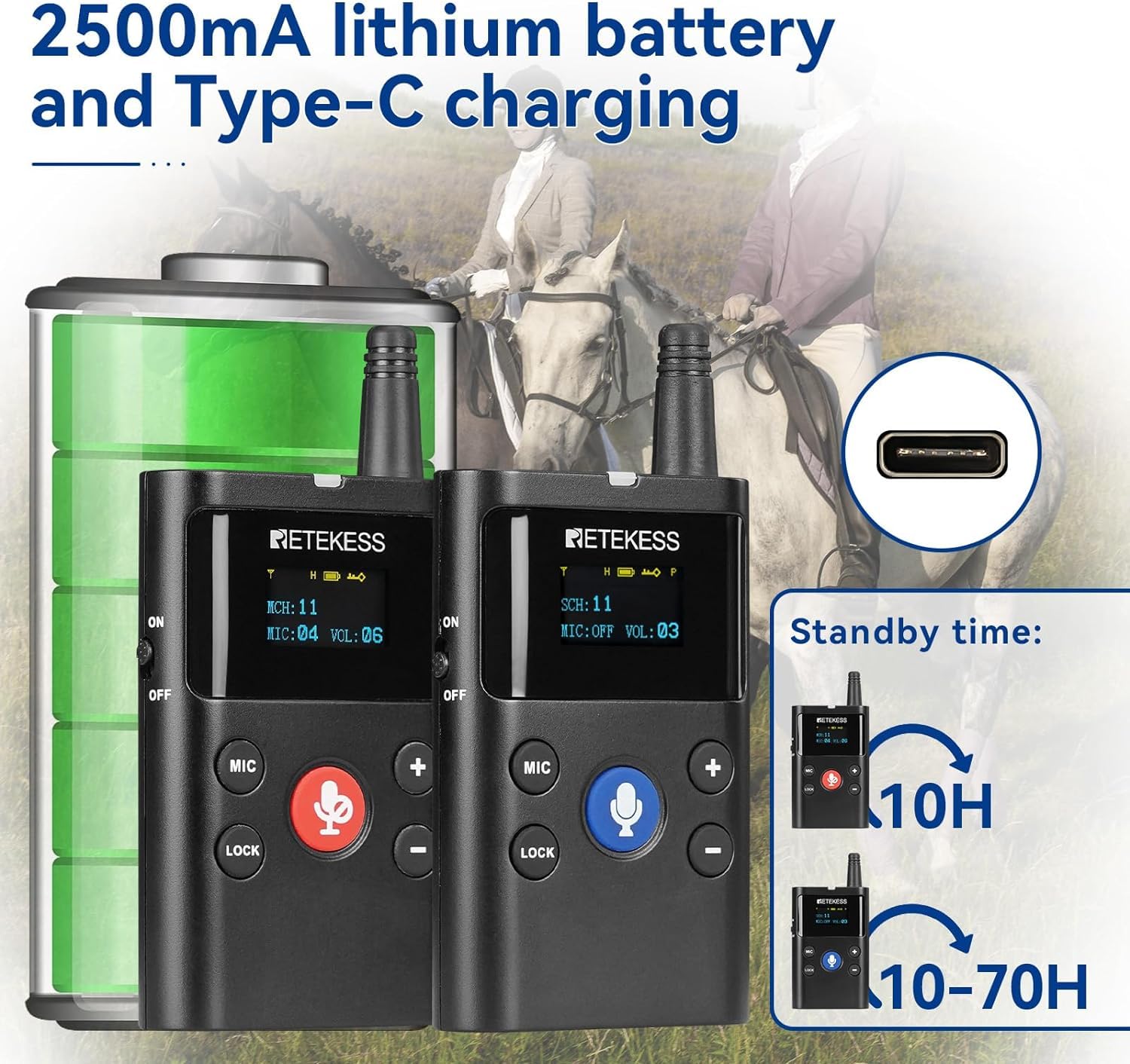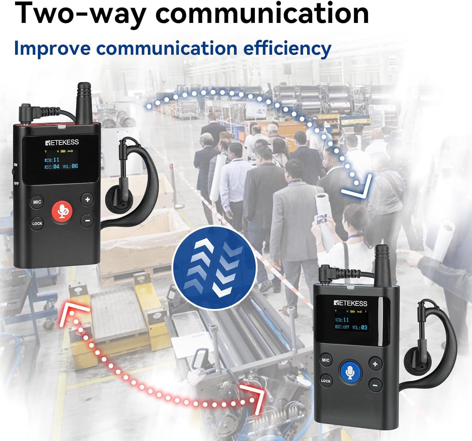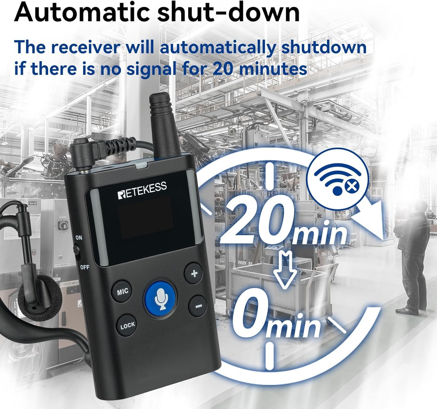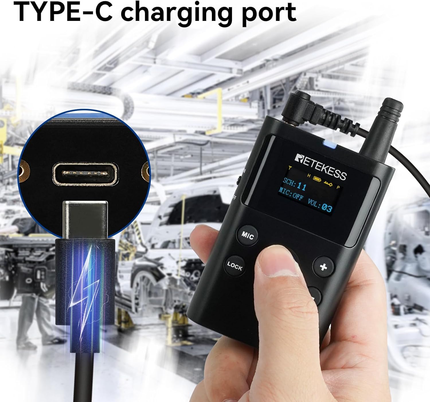 Long battery life; Retekess TT126 two way communication headsets has 10 h operating time for the transmitter and 10-70 h for the receiver when fully charged; ensure that participants can complete an entire factory tour without any interruptions due to a depleted battery