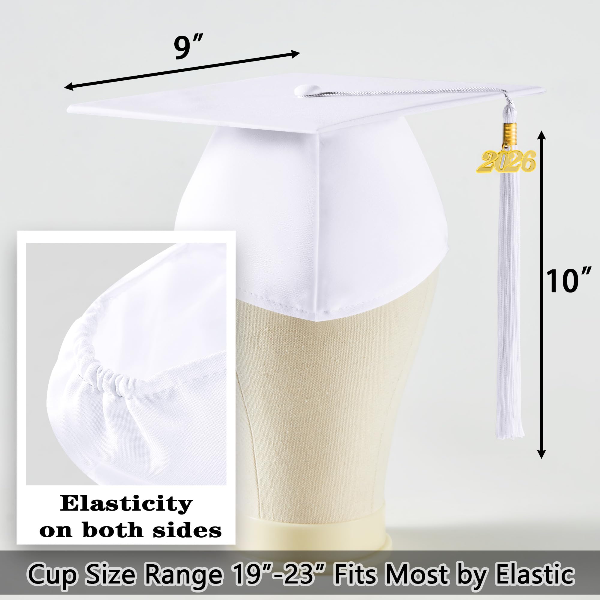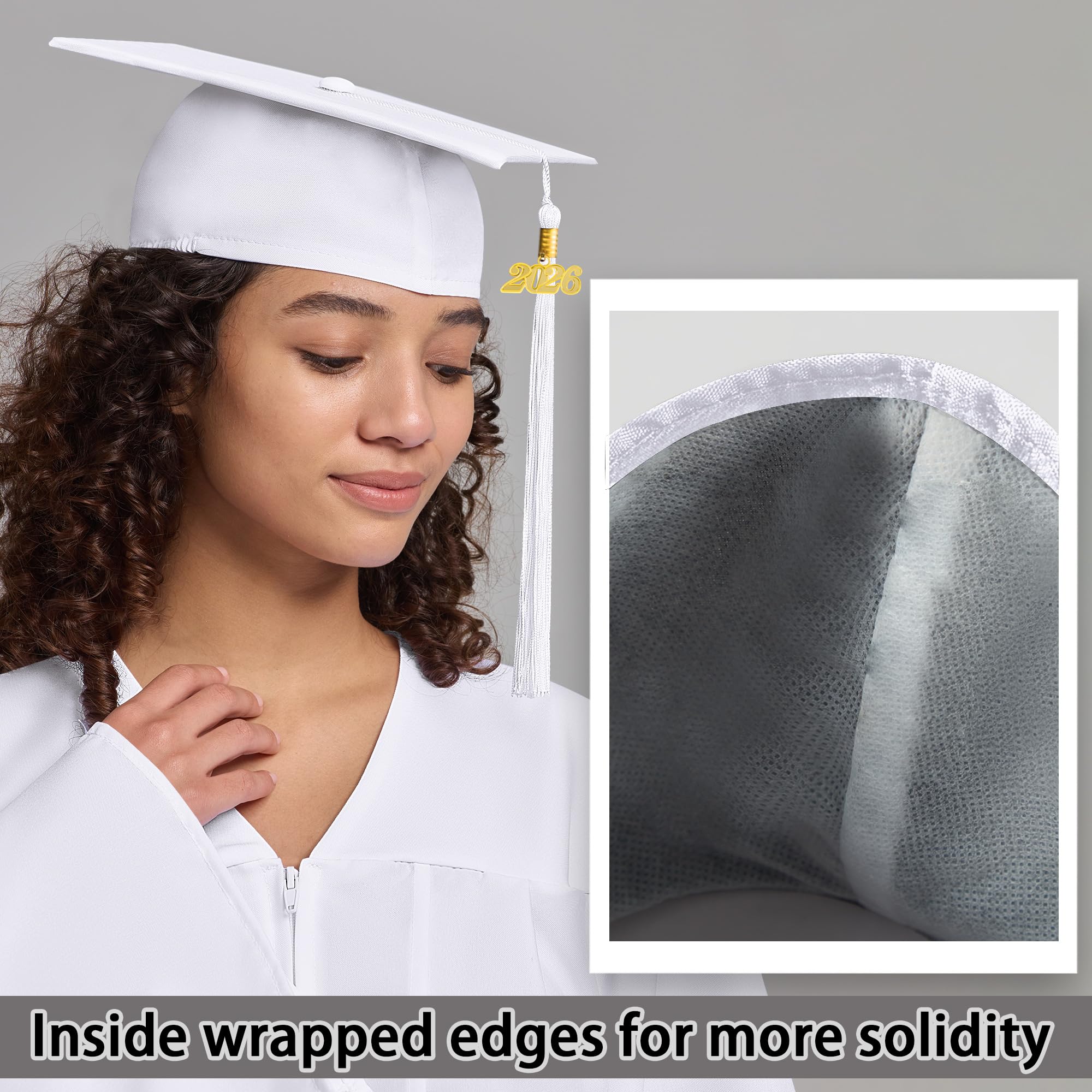 PRODUCT SPECIFICATIONS,PREMIUM MATERIAL:This graduation cap features a classic 9x9 inches hardboard top covered in high-quality matte polyester. It comes with a 9-inch long tassel and a detachable 2026 year charm. The elegant matte finish ensures you look professional and polished on your big day.