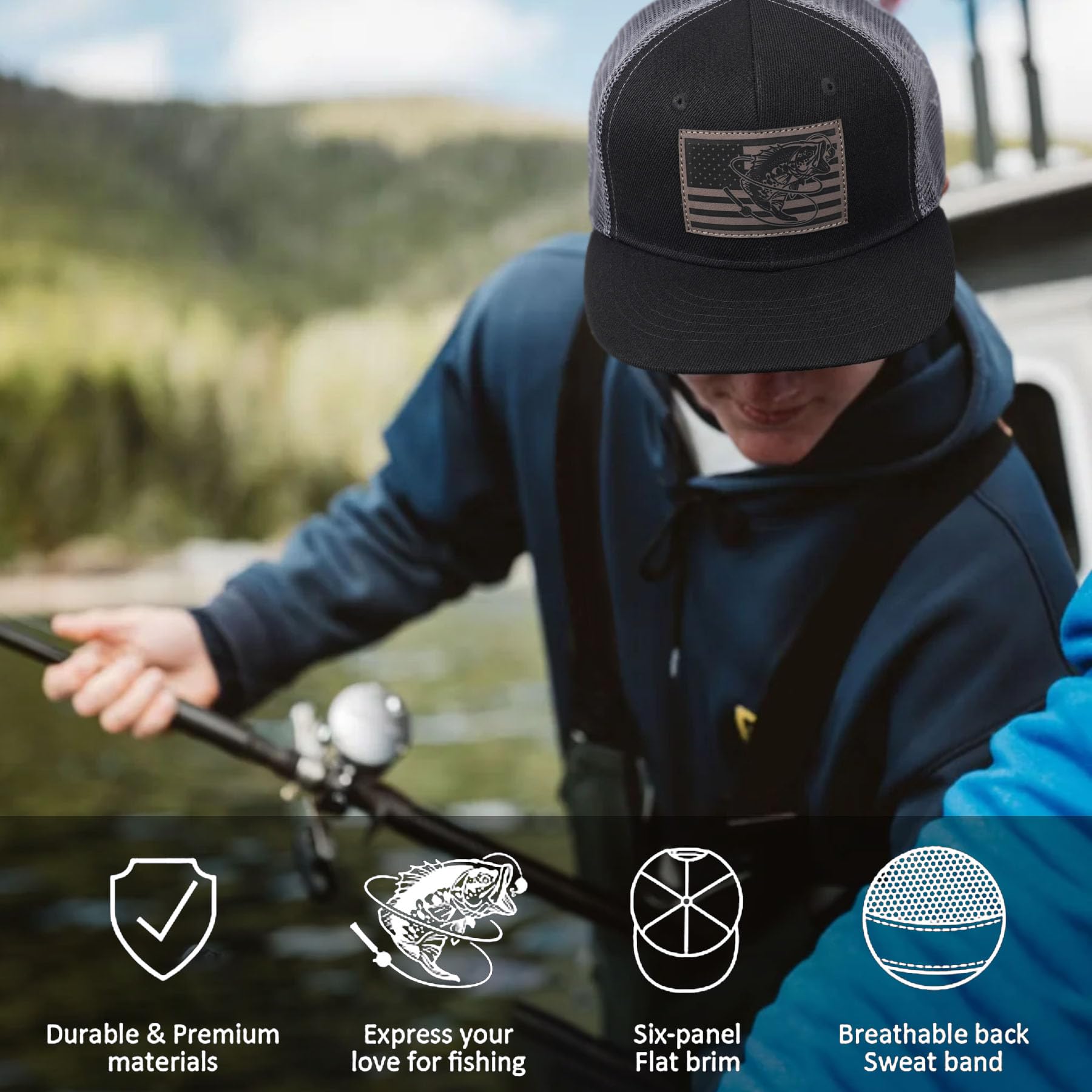 UV Protection&Cotton Sweatband: American flag bass fish hat has a flat brim with a stiff tall top, which protects the skin from harmful ultraviolet rays. Along with external protection, this fishing hat is also equipped with a cotton sweatband inside, which helps you to focus on fishing without worrying about sweat flowing into your eyes.