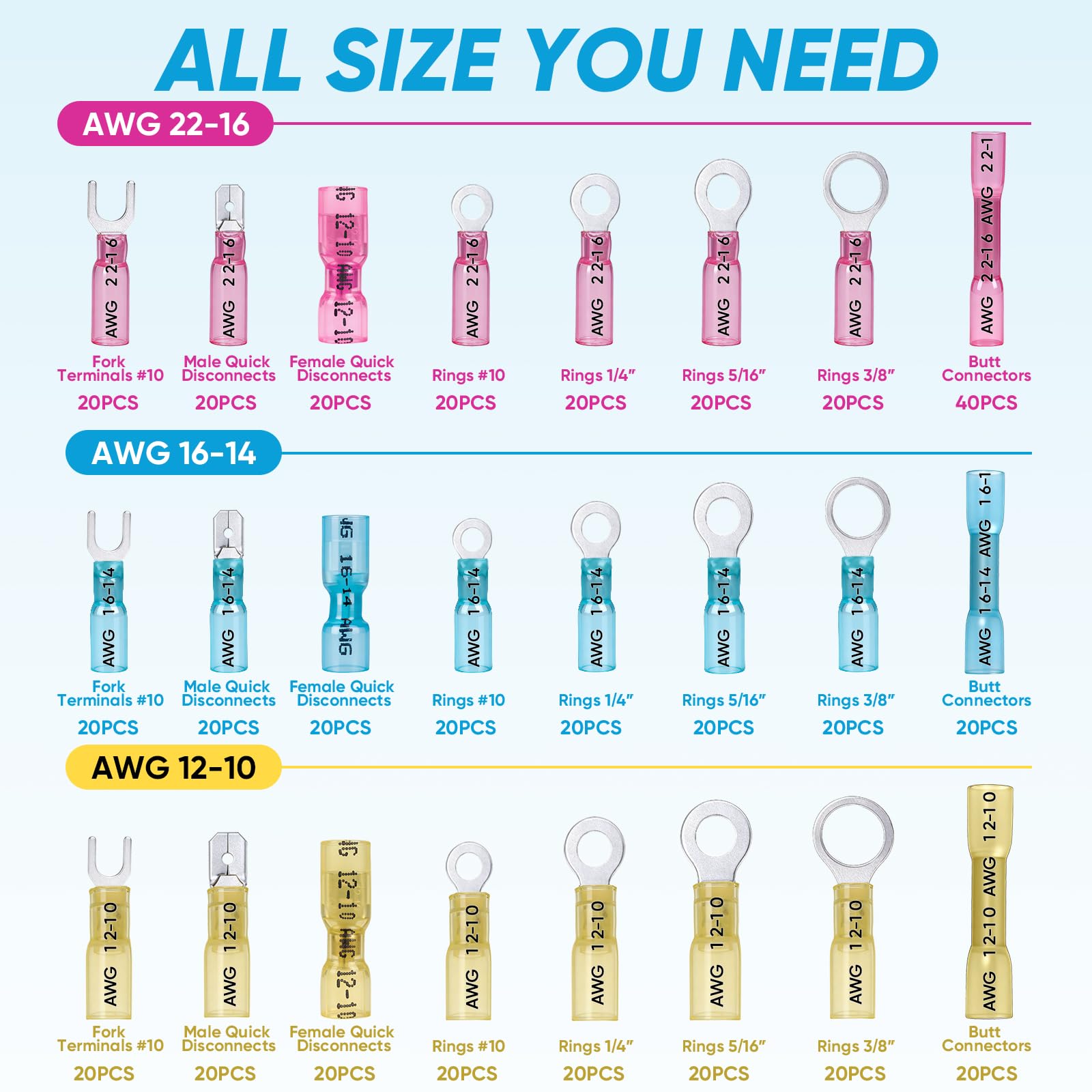 [TYPE and SIZE] The connector assortment includes red, blue and yellow connectors that can be used on wire AWG from 22 to 10. Five connector types: butt connector, ring connector (stud size: #10, ¼’’, 5/16’’, 3/8’’), female quick disconnect connector, male quick disconnect connector and fork connector (stud size: #10) are packaged in each connector kit.
