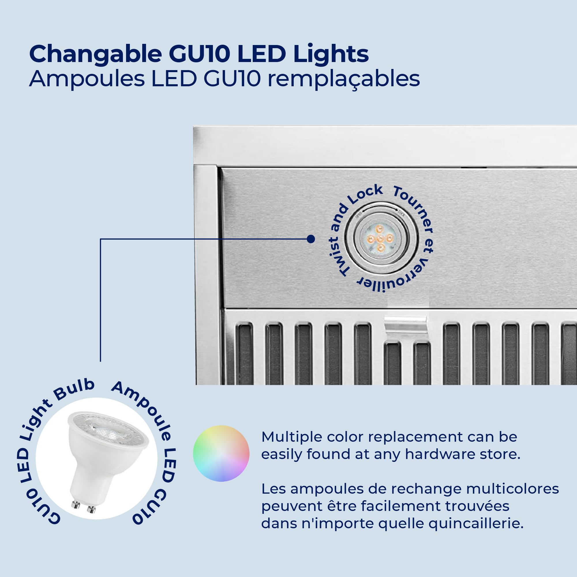 HIGHLY-CUSTOMIZABLE SETTINGS: Customize our kitchen hood 30 inch performance through 6-speed settings to set suction and noise levels. The standard 2700K light color gives off a warm glow but can be swapped out to match your kitchen’s lighting scheme.