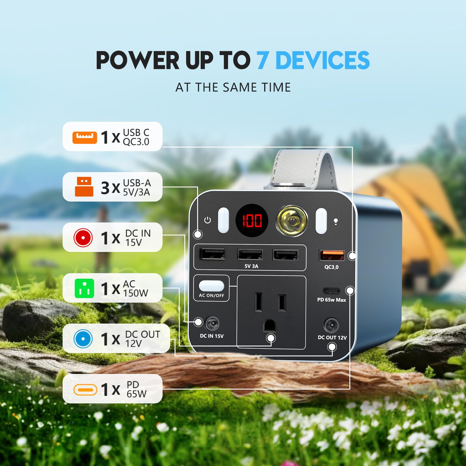 POWER UP TO 7 DEVICES SIMULTANEOUSLY: The battery pack is equipped with 3* USB ports, 1* QC 3.0 port, 1*PD 65W port, 1*AC 150W power outlet, and 1*DC output. It could provide you with electricity for multiple devices at the same time, making your camp life more convenient. (Note: If you want to charge faster, we recommend that you prioritize using the AC or PD port for charging.)