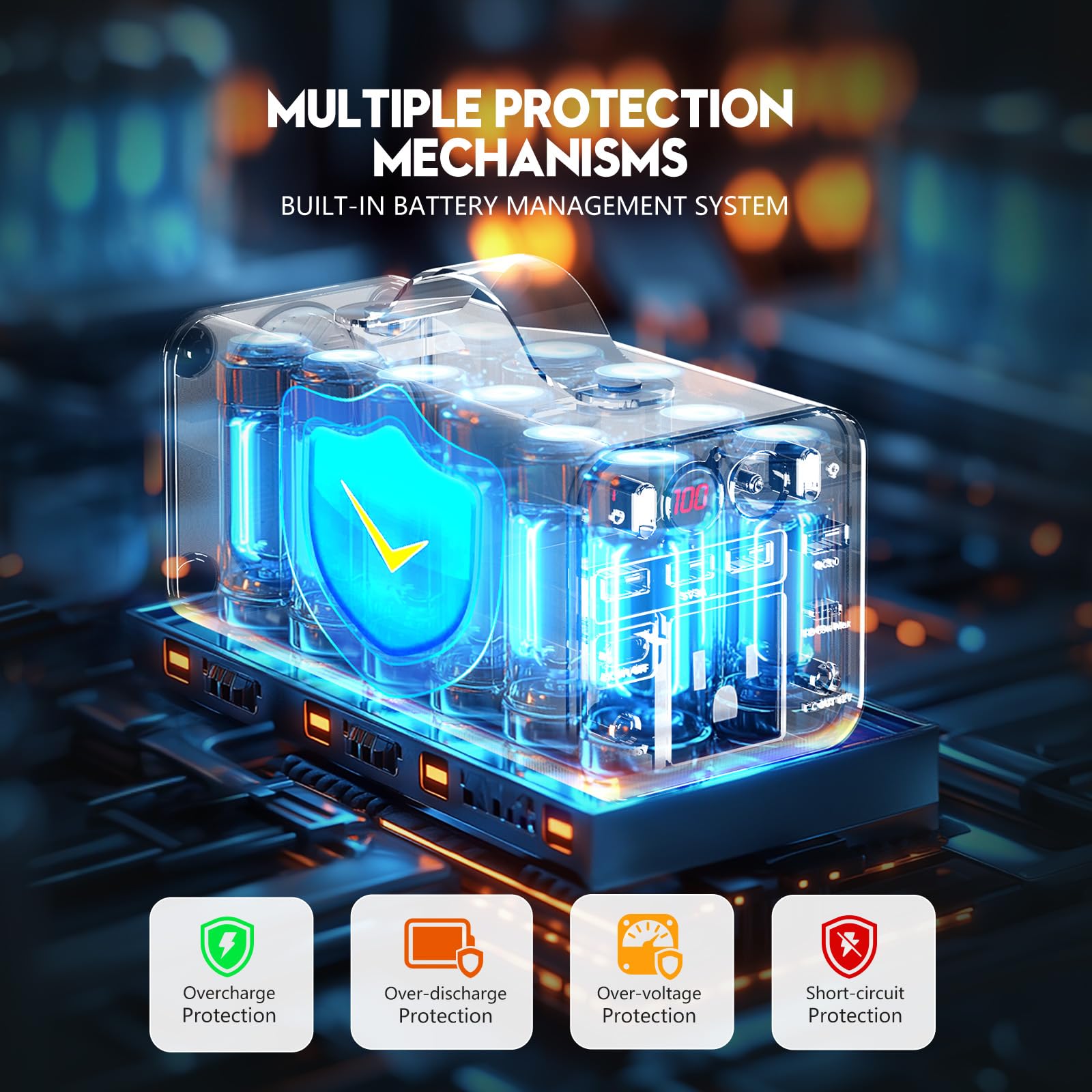 MULTIPLE PROTECTION MECHANISMS: We never compromise on the safety of this battery bank, the built-in Battery Management System (BMS) could protect it from over-temperature, over-voltage, over-power, over-current, and short circuits no matter the weather is cold or hot, it is outdoor or indoor.