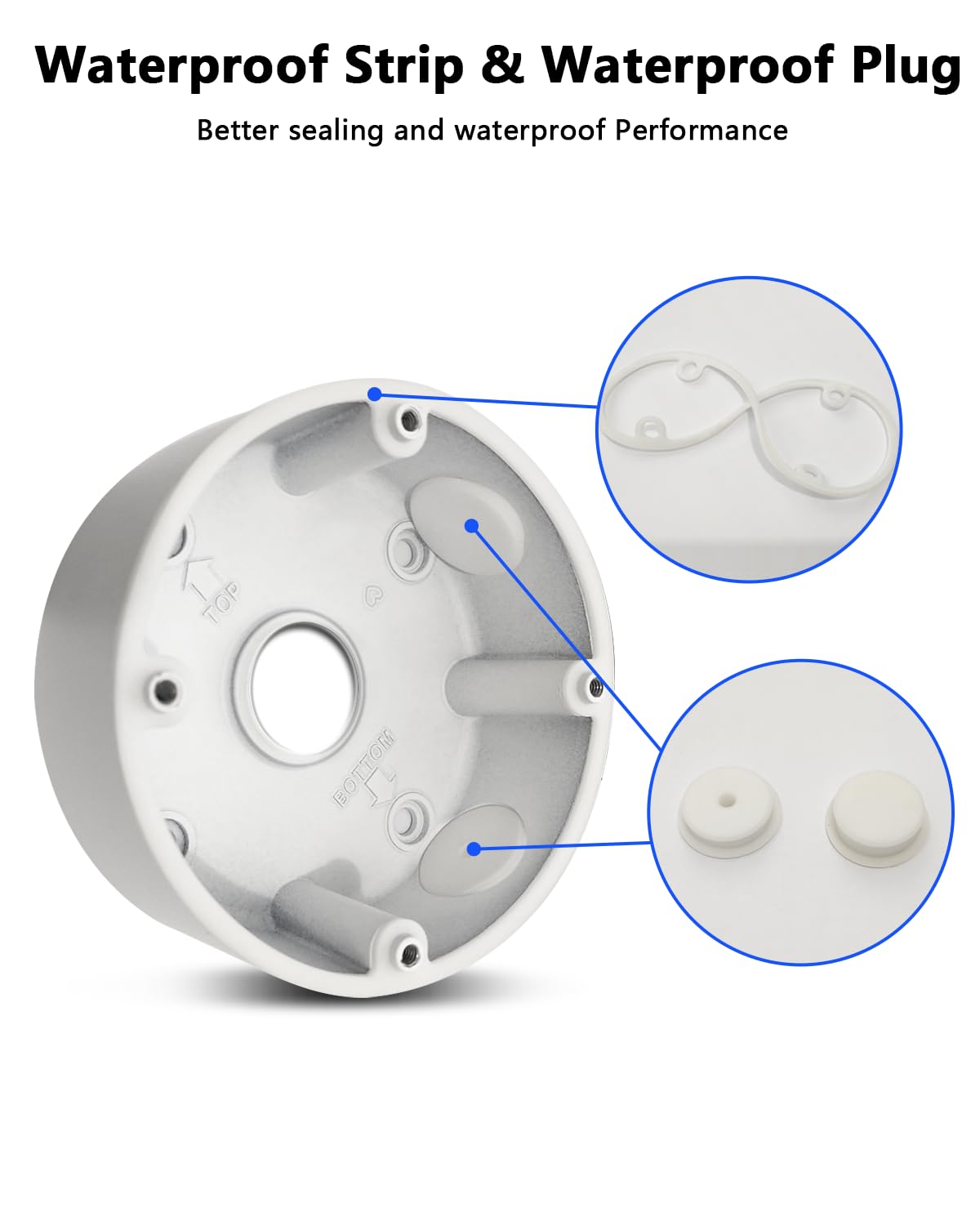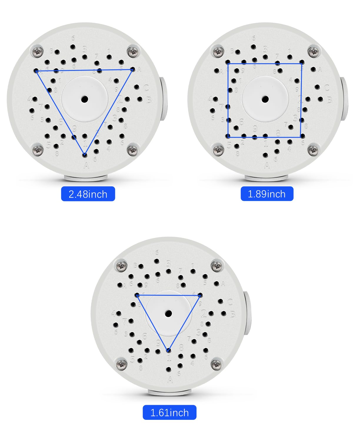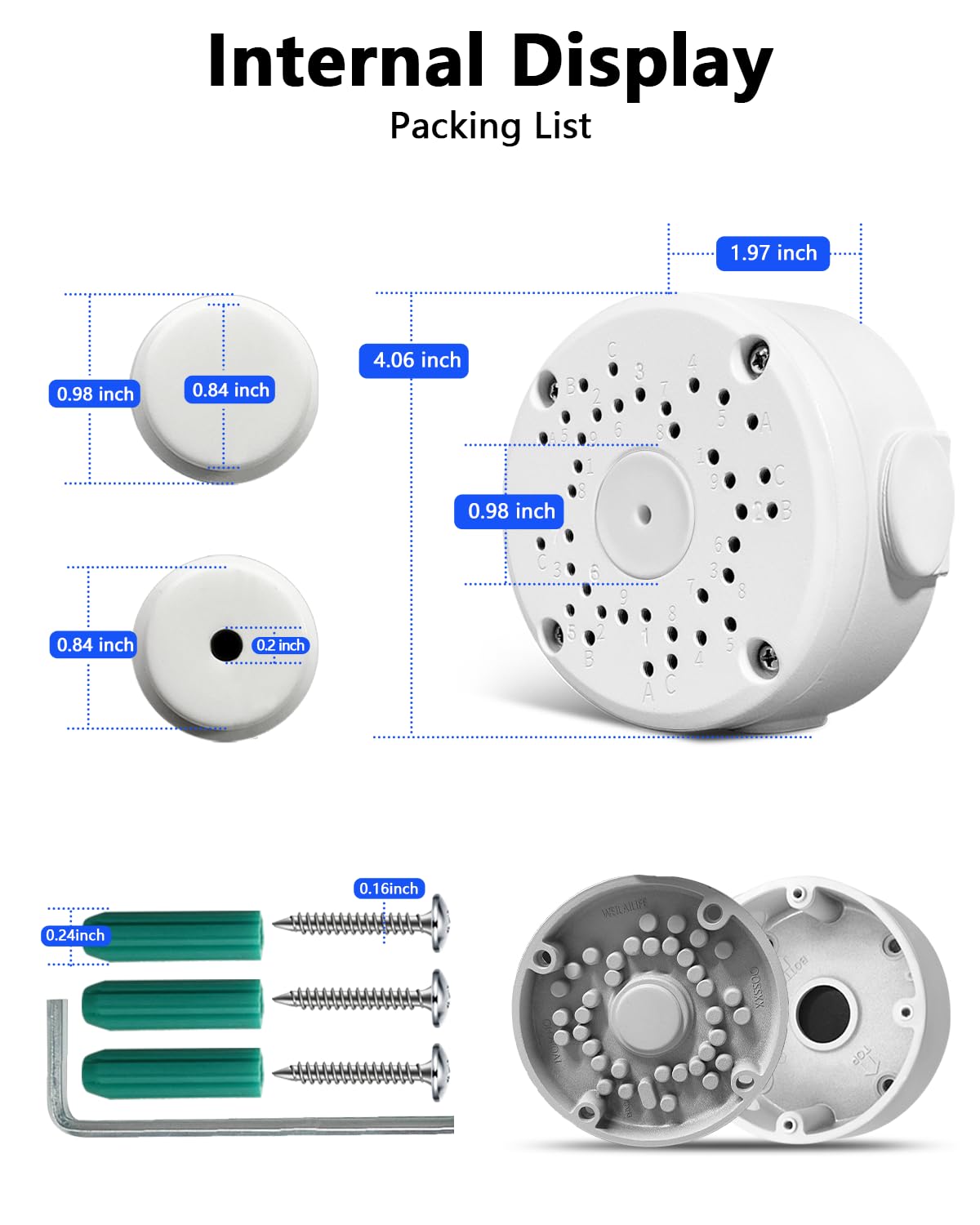 [FEATURES]- 3.94* 1.89 inch, plate center hole: 0.98 inch. Mounting type: Surface Mount; Electric enclosure material:Metal & Rubber; Main color: White. Works with surveillance camera (You can drill holes on the plate to match different cameras).