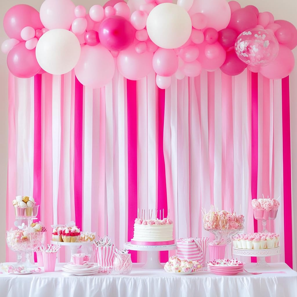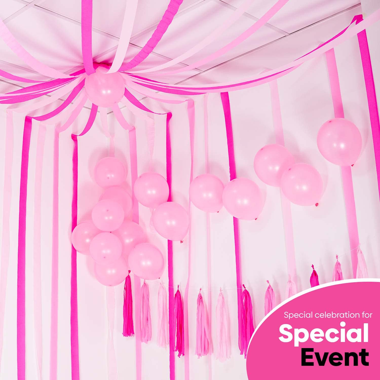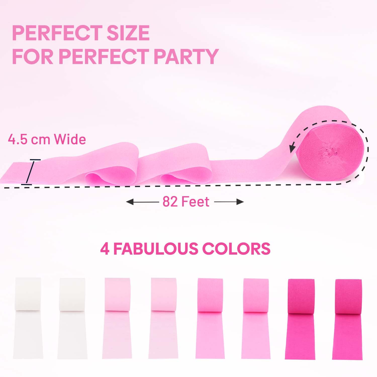 Value Pack Includes: We offer 8 precisely rolled party streamers in pink, light pink, hot pink, and White colors. Each streamer measures 4.5cm wide and extends to a length of 82 feet, providing ample material for a variety of creative applications. Each roll 82 ft long and 1.8" wide.
