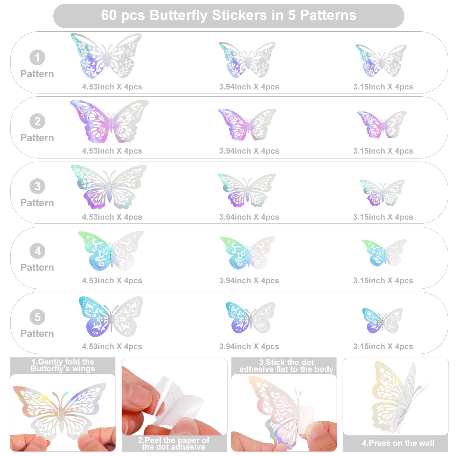 What You Will Receive - You will get 60 pcs butterflies wall stickers, each coming with double-sided glue dots. 12 pcs pattern 1, 12 pcs pattern 2, 12 pcs pattern 3, 12 pcs pattern 4 and 12 pcs pattern 5, each pattern has 3 sizes (3.15", 3.94", 4.53").