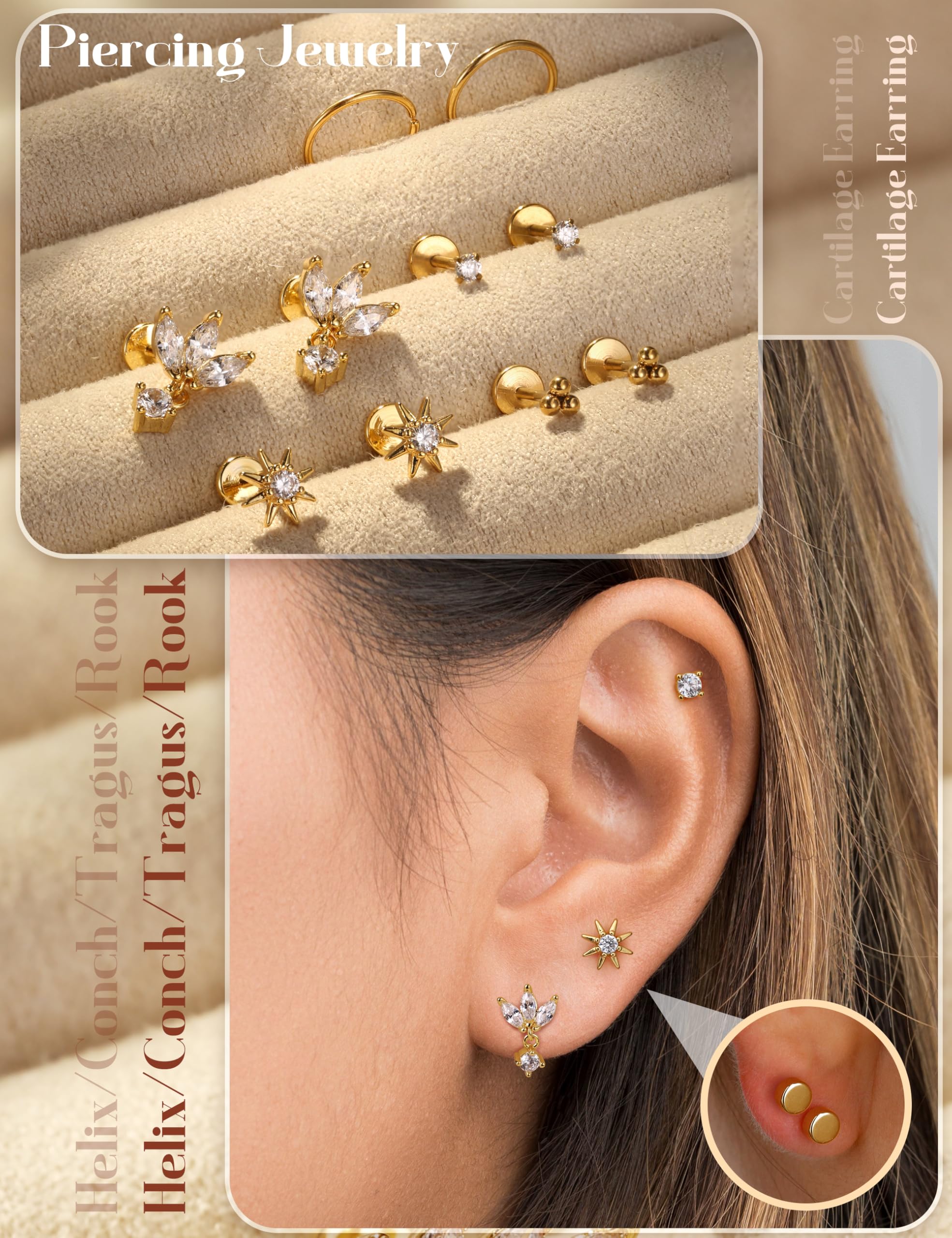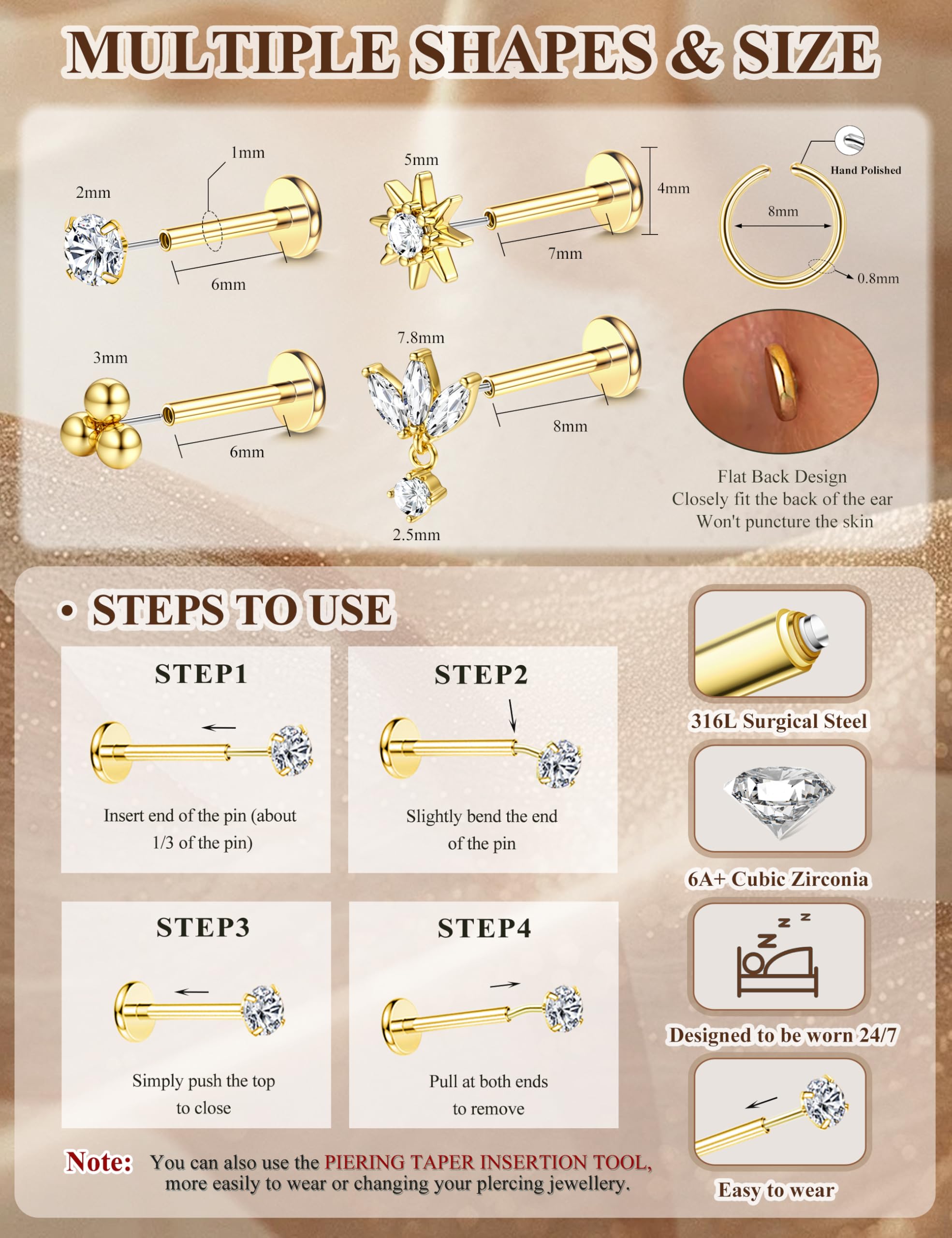 Threadless Flat Back Earrings Set:1 order you will get 4 pairs push in flat back earrings studs ,2pcs 8mm hoops and 1pcs of straight piercing taper.Piercing Stud Gauge Size: 16G(1.2mm)/18G(1.0mm)/20G(0.8mm) Bar Length: 6mm/7mm/8mm,meet your different needs.Color: silver/18K gold Plated .AAAAAA+ cubic zirconia,which is staying securely set, Long-lasting shine.Dainty tiny stud earrings are suitable for most women and men.EACH POST FITS ALL THESE THREAD TOP