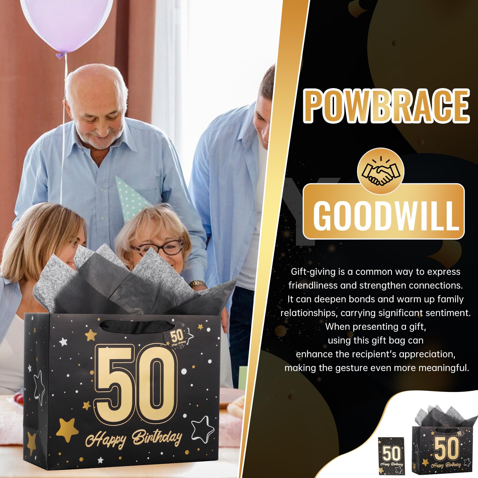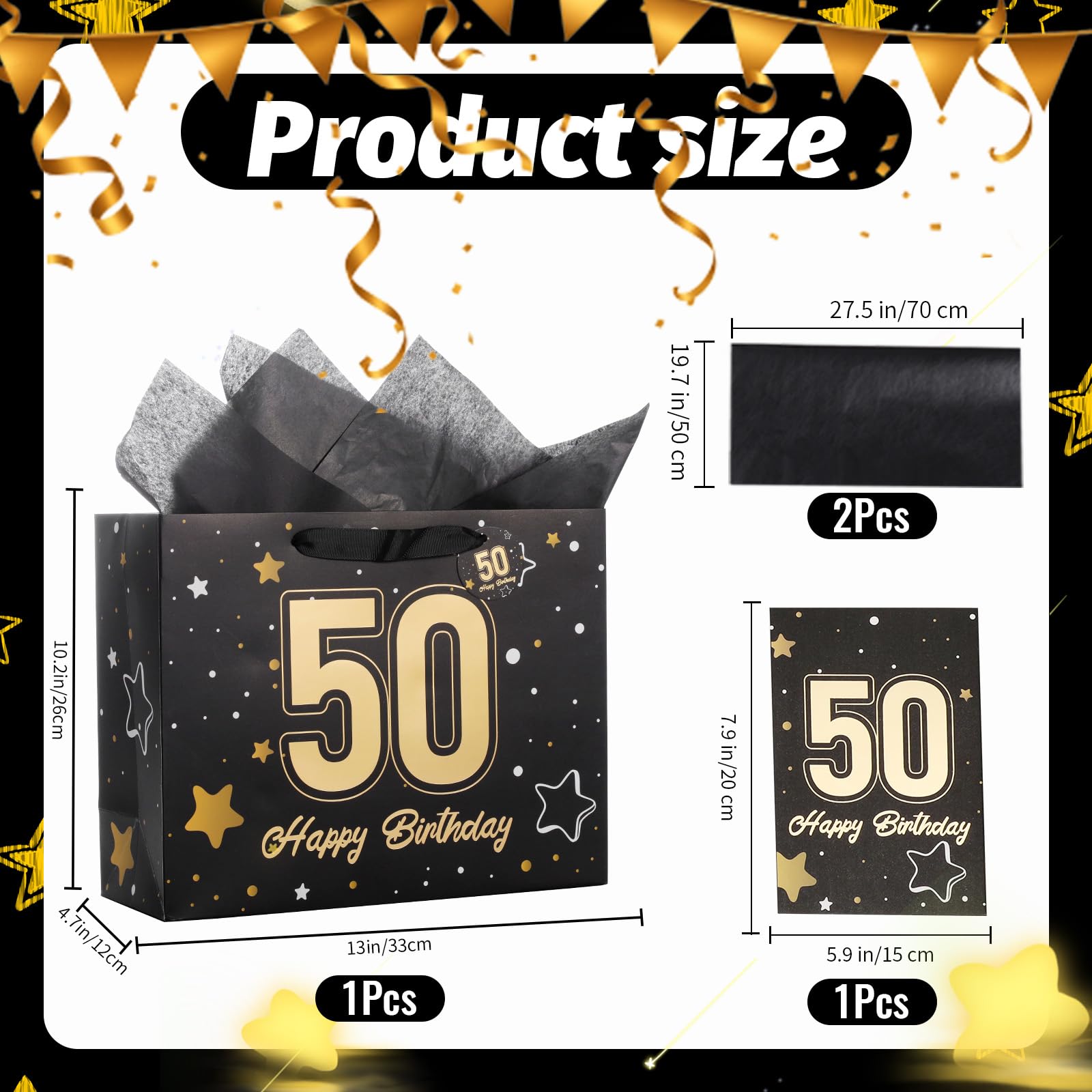 【50th Birthday Gift Bag】This 50th birthday gift bag set includes matching tissue paper, a greeting card, and tags. The decorative ribbon handles add a festive touch. It simplifies gift wrapping for a hassle-free experience. The gift bag measures 13" W x 10.2" H x 4.7" L; the card measures 7.9" W x 5.9" H.