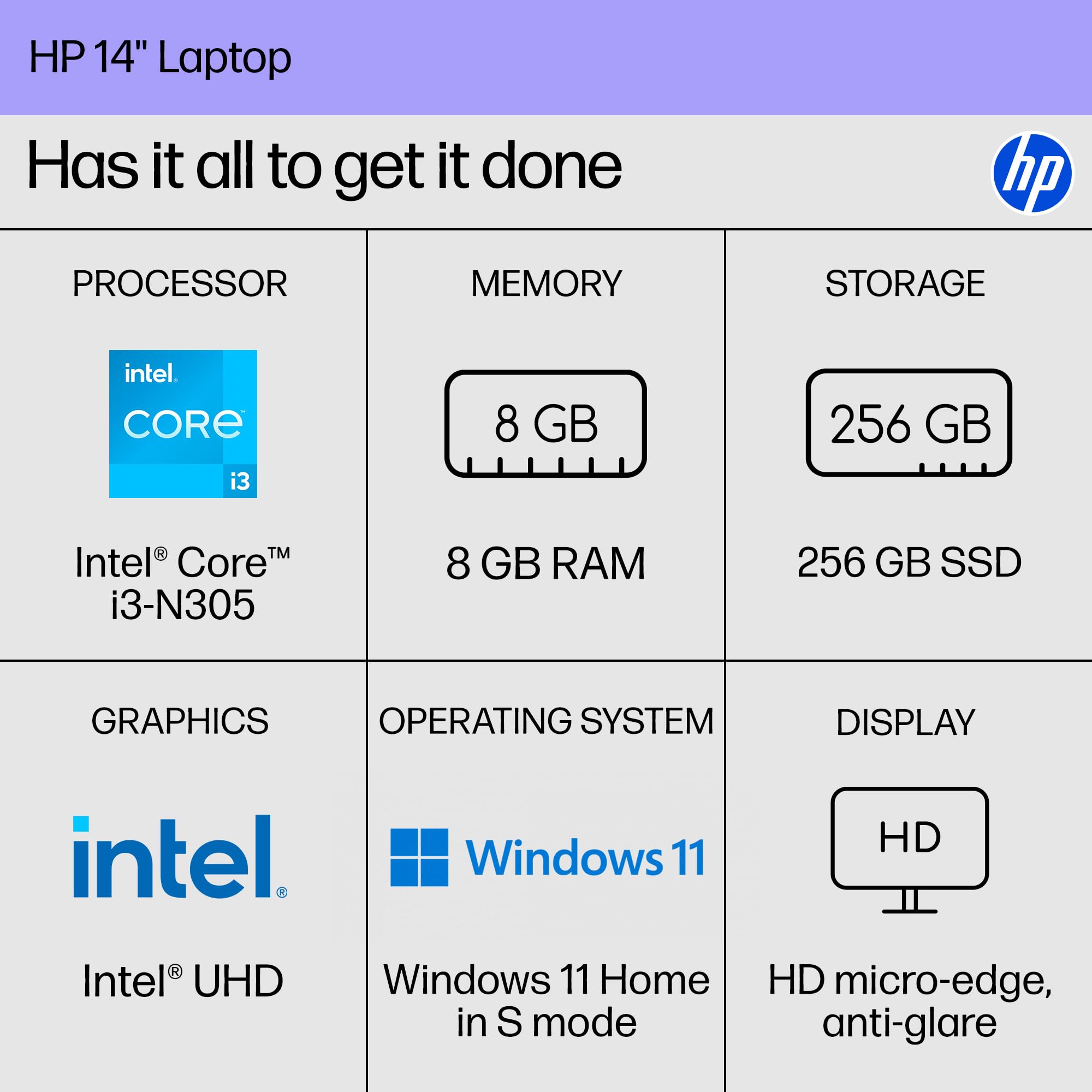 The HP 14" Laptop helps you take on your day with real power. The reliable processing power of an Intel Core processor and long-lasting battery life help you stay in the zone longer, whether it's maximizing your workflow or creating personal projects. Get lost in a remarkable entertainment experience as the high definition display delivers boosted definition and crisp quality. Chat with ease with a high quality camera with a privacy shutter you can close when not in use, keeping you safe online. Get every point across with dual array digital microphones and advanced noise reduction software. The HP 14 Laptop comes with a 45 W AC power adapter and goes from 0 to 50% charge in 45 minutes. Plus, it contains recycled materials and is EPEAT Gold registered and ENERGY STAR Certified. HP is here to help. This HP computer comes with 1-year limited hardware warranty and 90-days limited technical support for software and initial setup with 24-hour, 7 days a week web support when shipped from and sold by Amazon.com.
