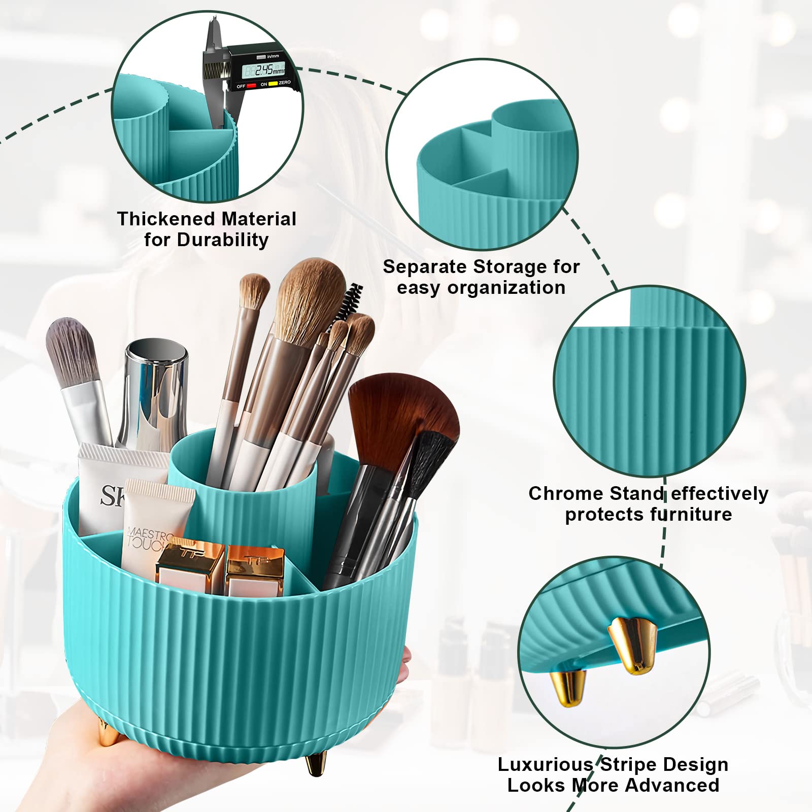 Size of Makeup Storage Organizer:Dimension is 4.9*5.9 inch. (15*12.5cm), The rotating makeup organizer features 5 compartments to accommodate your makeup brushes, nail polish, lipstick as well as small accessories, The divided spinning organizer brings you a fashion-forward way to keep your accessories more organized and easier to find.