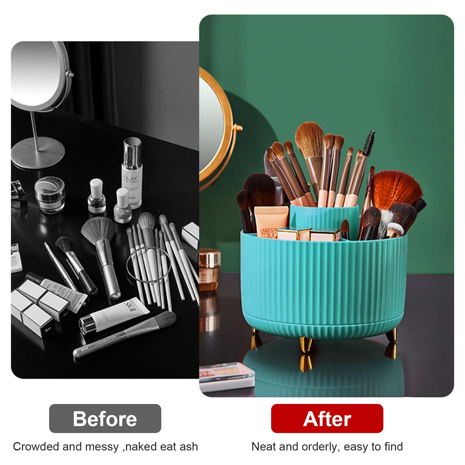 360° Rotation Makeup Brush Holder:This rotating makeup brush organizer can be rotated 360°, you can easily view and get items from all directions, very convenient, the high-quality roulette at the bottom makes the rotation very smooth, stable, and easy to rotate! Simply spin the makeup brush organizer left or right to store or take out your things, this storage organizer allows you to keep all of your things within reach.