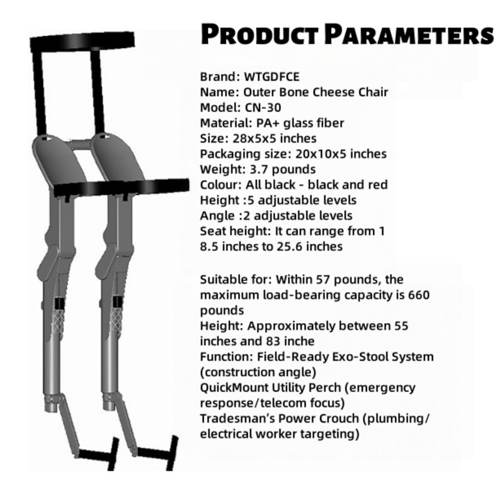 Brand: WTGDFCE Name: Outer Bone Cheese Chair Model: CN-30 Material: PA+ glass fiber Size: 28x5x5 inches Packaging size: 20x10x5 inches Weight: 3.7 pounds Colour: All black - black and red Height :5 adjustable levels Angle :2 adjustable levels Seat height: It can range from 18.5 inches to 25.6 inches Suitable for: Within 57 pounds, the maximum load-bearing capacity is 660 pounds Height: Approximately between 55 inches and 83 inche Function: Field-Ready Exo-Stool System (construction angle) QuickMount Utility Perch (emergency response/telecom focus) Tradesman’s Power Crouch (plumbing/electrical worker targeting) Product Features: WTGDFCE’s Exo-Stool deploys in 3 secs for telecom/emergency crews. Rugged PA fiberglass holds 165 lbs, 15° legs grip slopes. 3-height ergonomics (47-52cm) for tradesmen. Brand Edge: Patented cam-lock tech + industrial PA build targets pros: scratch-resistant for wildfire ops, non-slip feet for plumbers/linemen. Crisis-tested durability meets OSHA-grade specs.