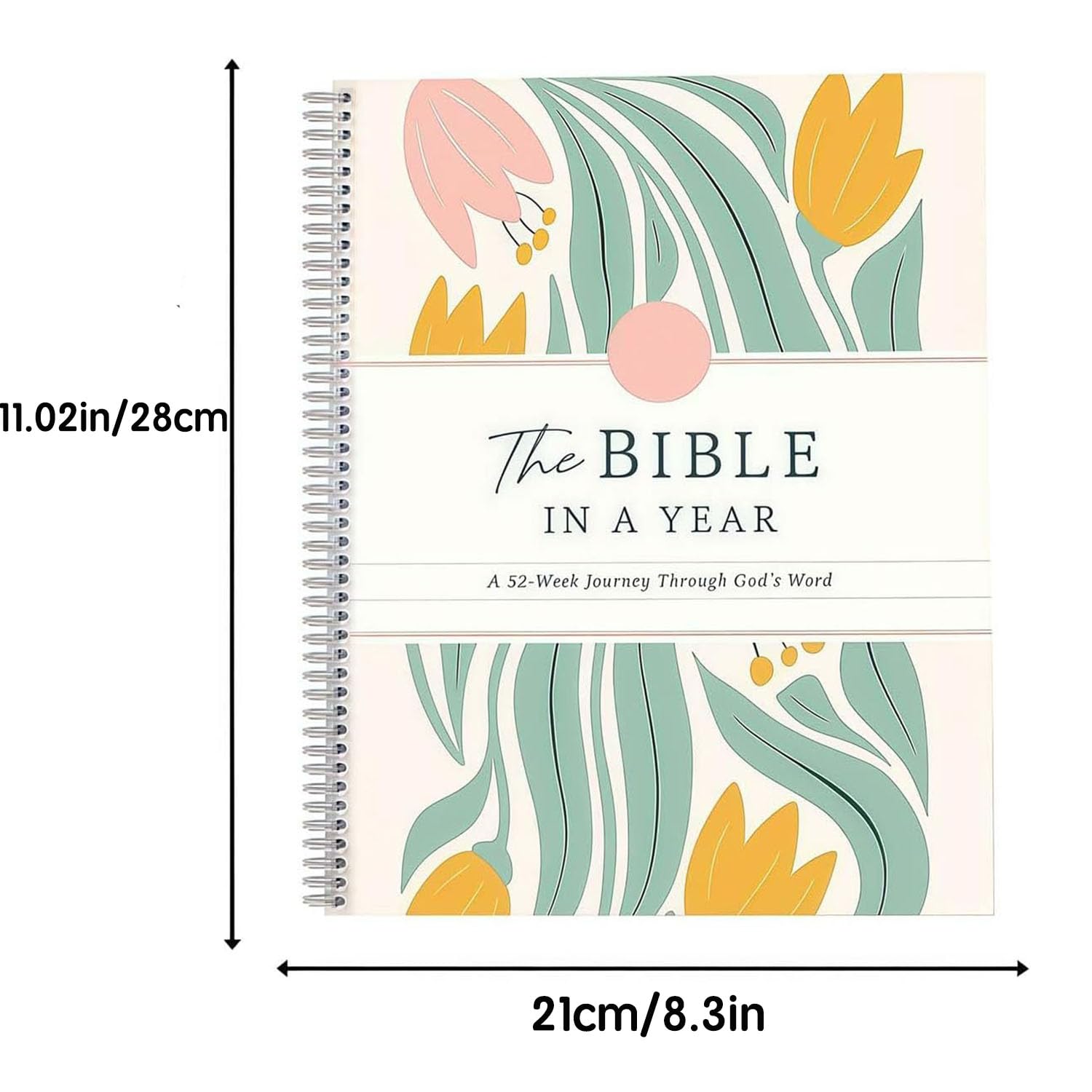 Product Description: Start your own spiritual transformation year! Designed for modern women, A Year in the Bible is your ideal companion for practicing A Year in the Bible. The revolutionary The Spiral Bible design and patented spiral binding allow for a perfect 180° flat lay, completely freeing your hands. The inner pages are specially designed as Spiral Bible with Note Taking Space, providing wide margins and a dedicated note-taking area for you to record your reflections and feelings. The carefully planned The Bible in 52 Weeks for Women study system systematically guides you from Genesis to worship, and deeply embeds the truth into your life through daily core scriptures, life application questions, and weekly blessing prayers. The high-quality 50-pound thick paper effectively prevents ink from seeping through, ensuring that your study notes will last forever. Whether it is morning devotion or group sharing, this clearly structured and freely written Bible is the perfect souvenir for your deep learning and life growth throughout the year. Embrace this annual spiritual journey tailored for women now!" Specification Name: The Bible In A Year: A 52-Week Study Weight: 400g/14.2oz Product size: 28*21cm/11.02*8.3in Material: Paper Package Include: 1/2 pcs * The Bible In A Year: A 52-Week Study 1 pcs* Metal Pen 1 pcs*gift box 2 pcs*refills