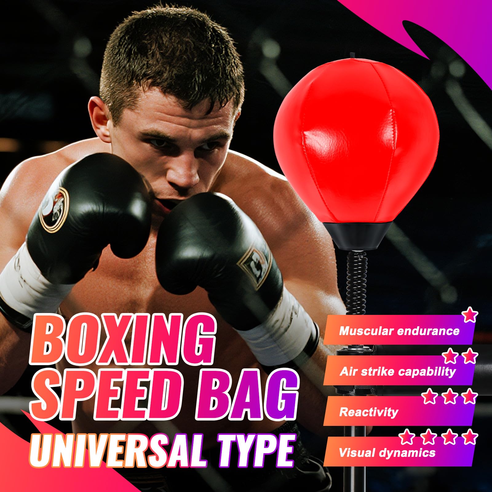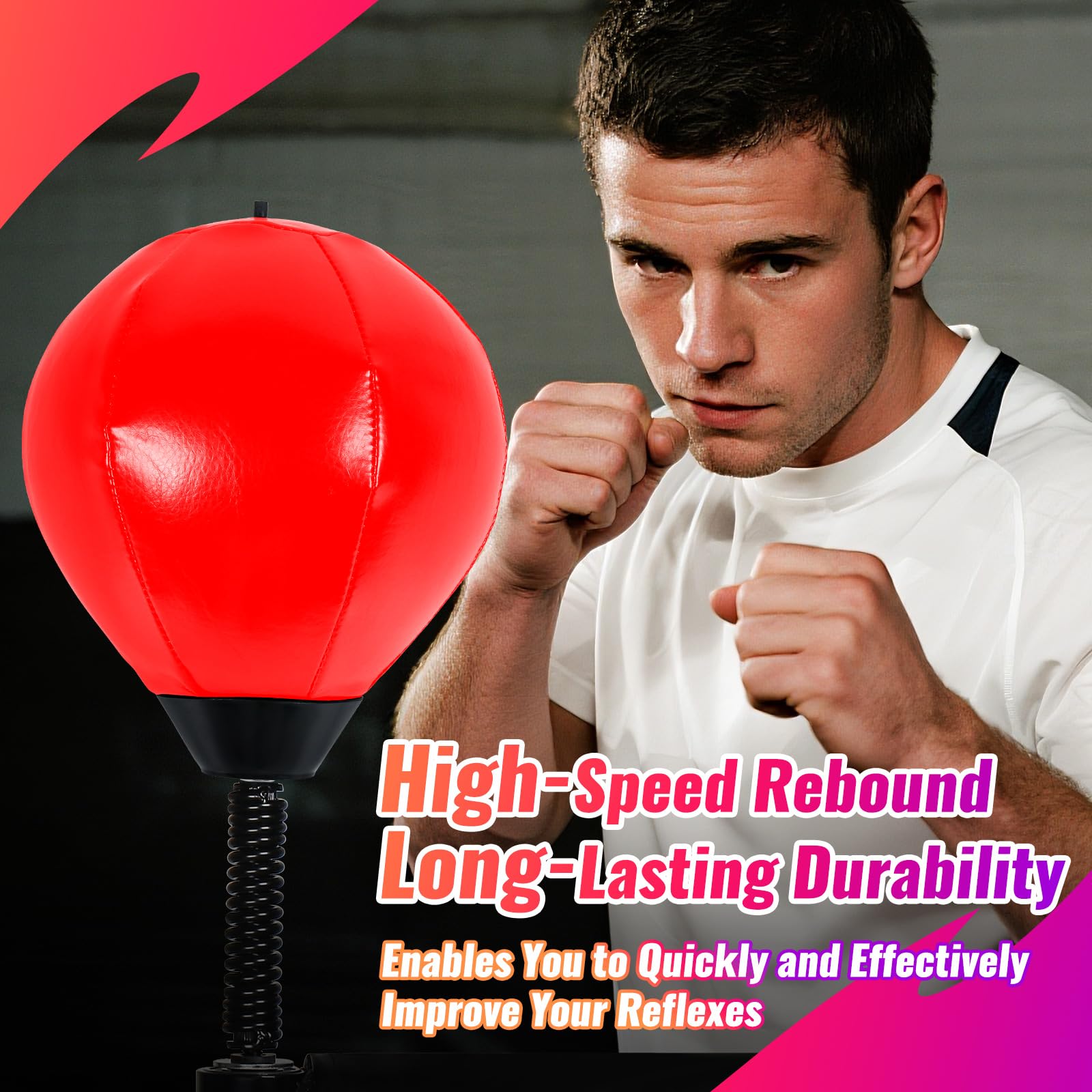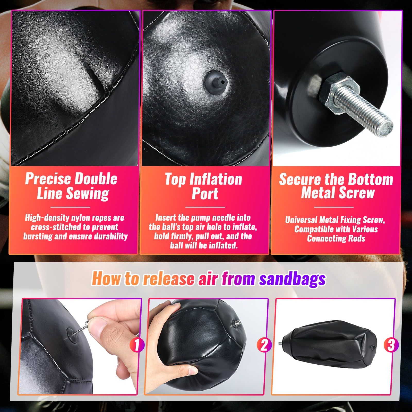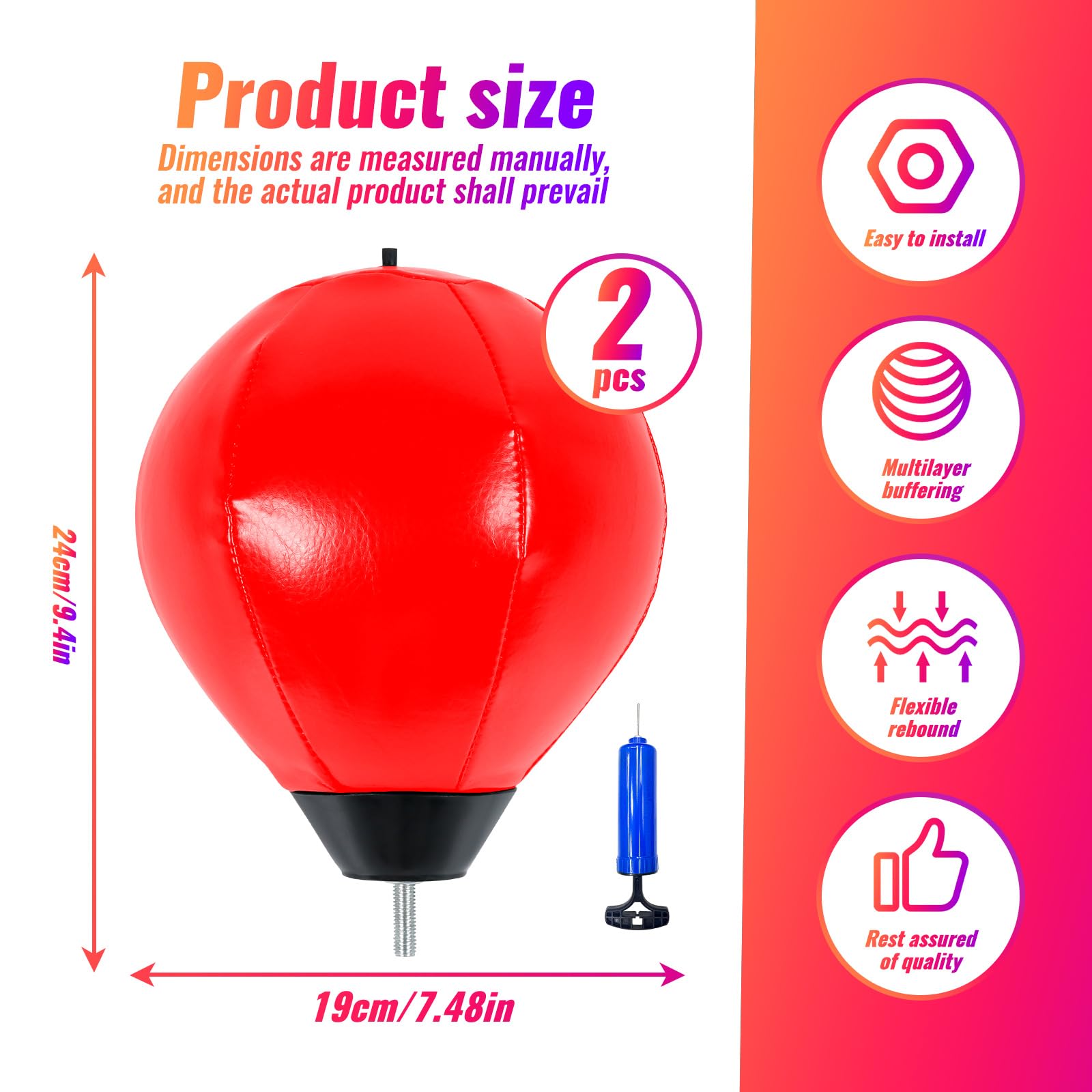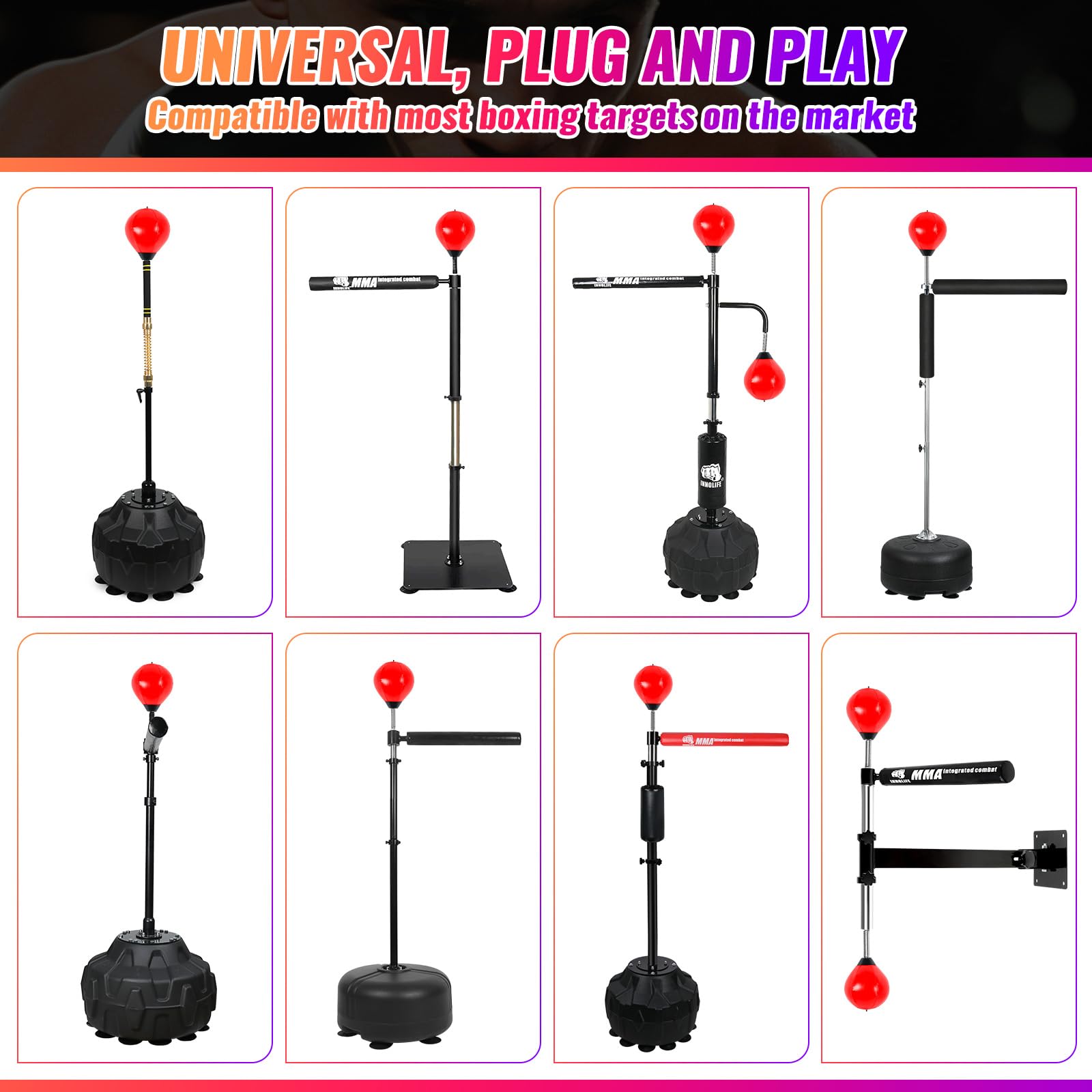 Advantages of our INNOLIFE speed ball equipment: 1) High-quality materials, long service life 2) 90° Effective rebound up strong and thick spring high speed rebound without deformation 3) Boxing Speed Ball - Universal 8mm Screw - Replaceable Spare Sandbag x 2 4)Pump x 1