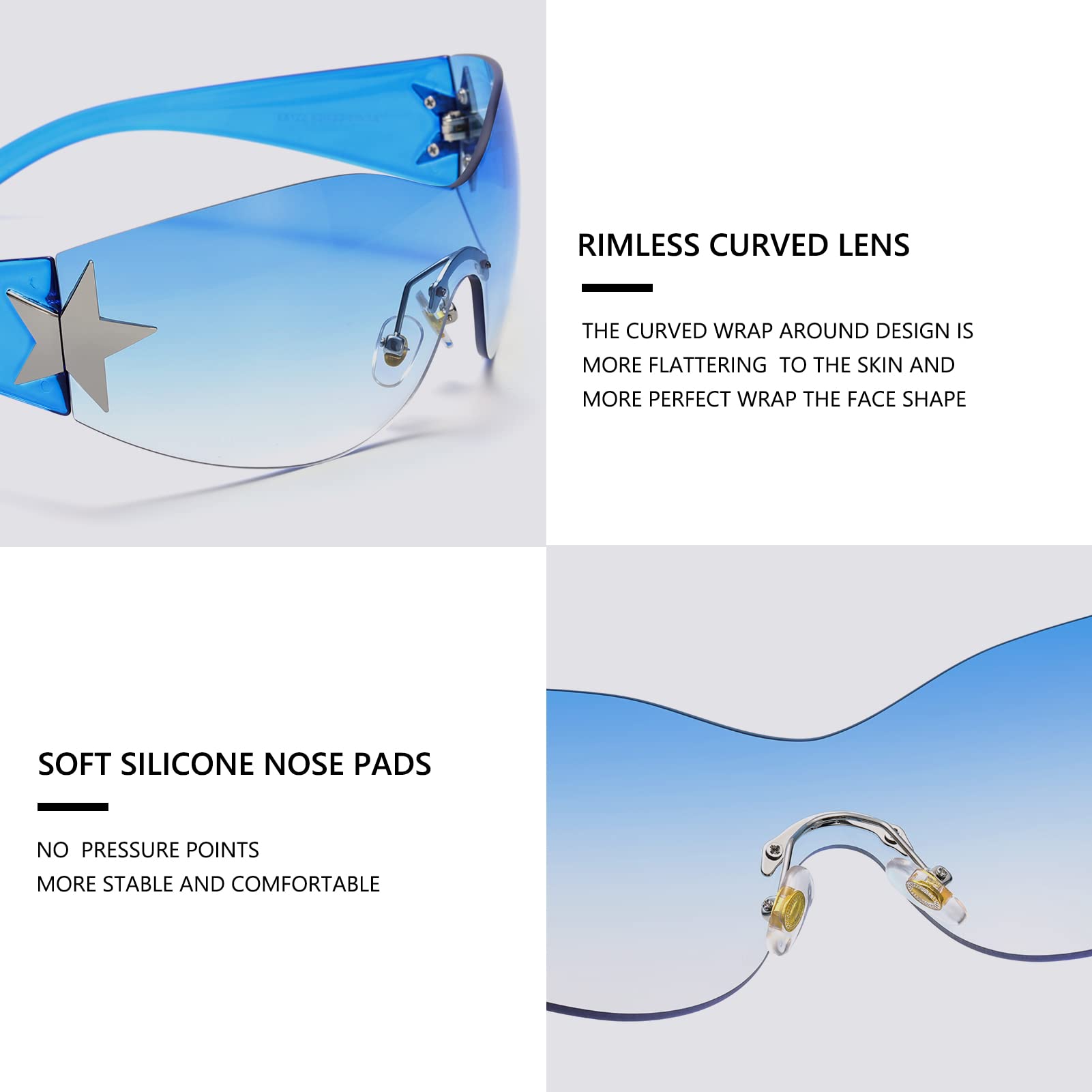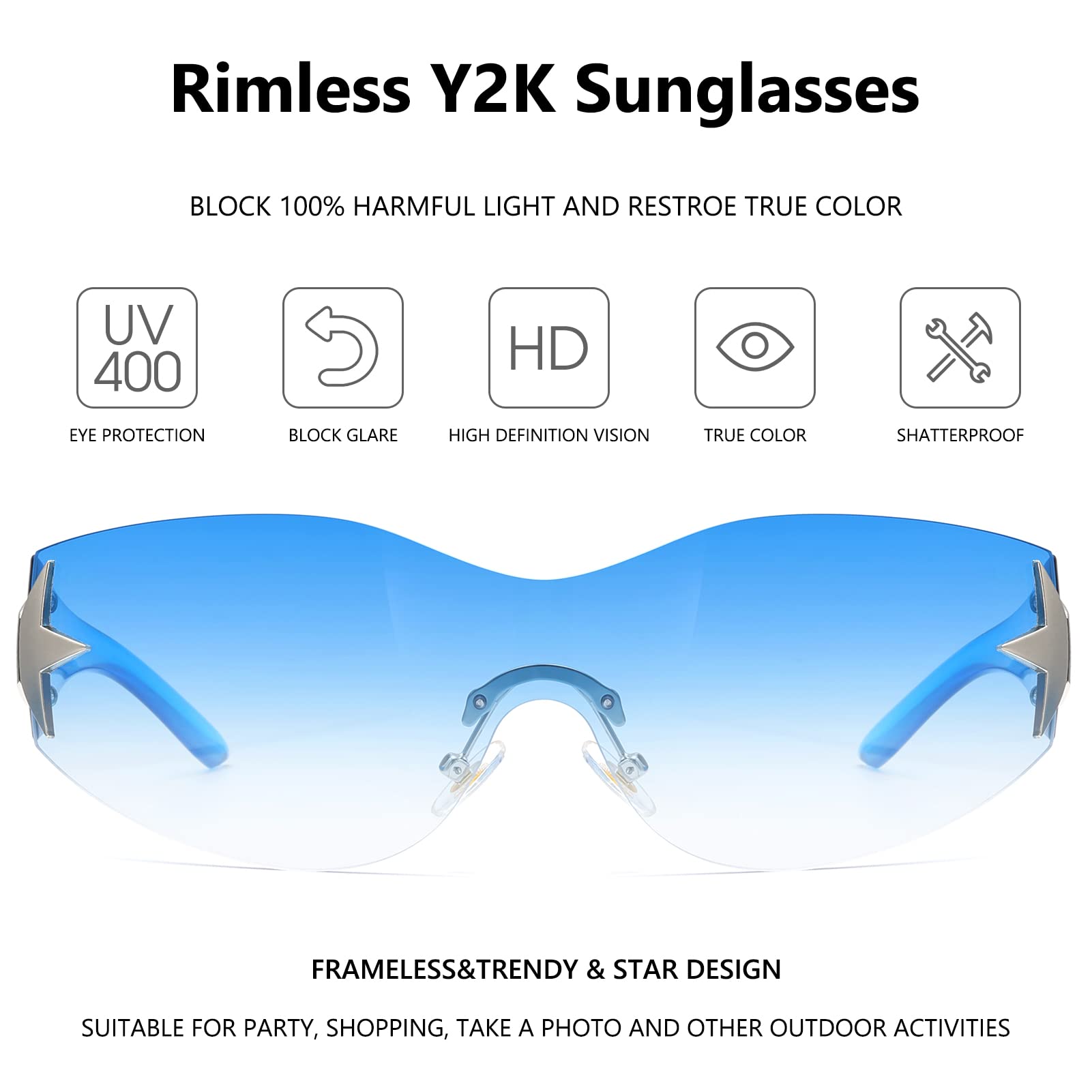 Rimless Y2K sunglasses for women, with a one-piece lens that wrap around the eyes in all direction, perfectly fits the contour of your face, full of futuristic technology and very fashionable