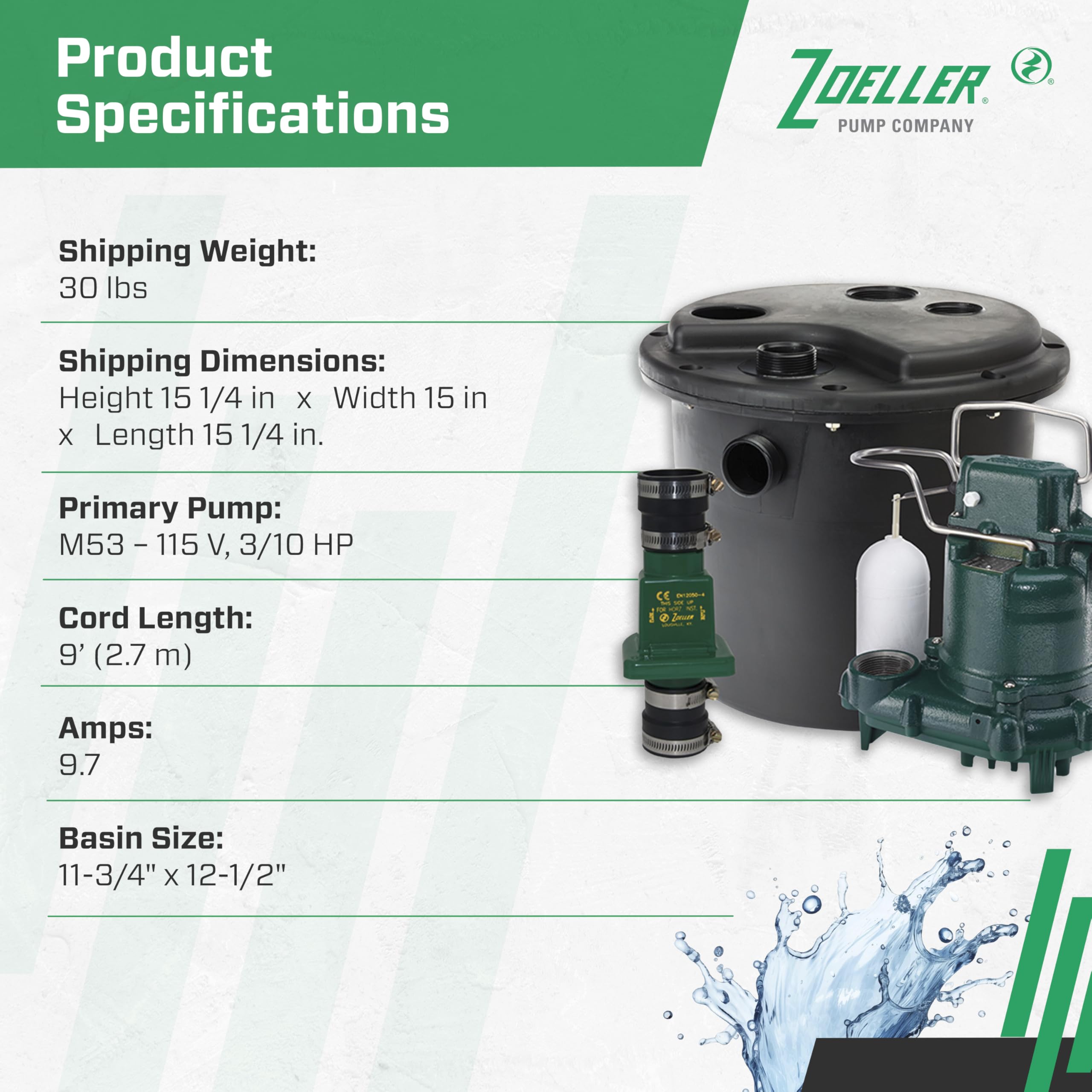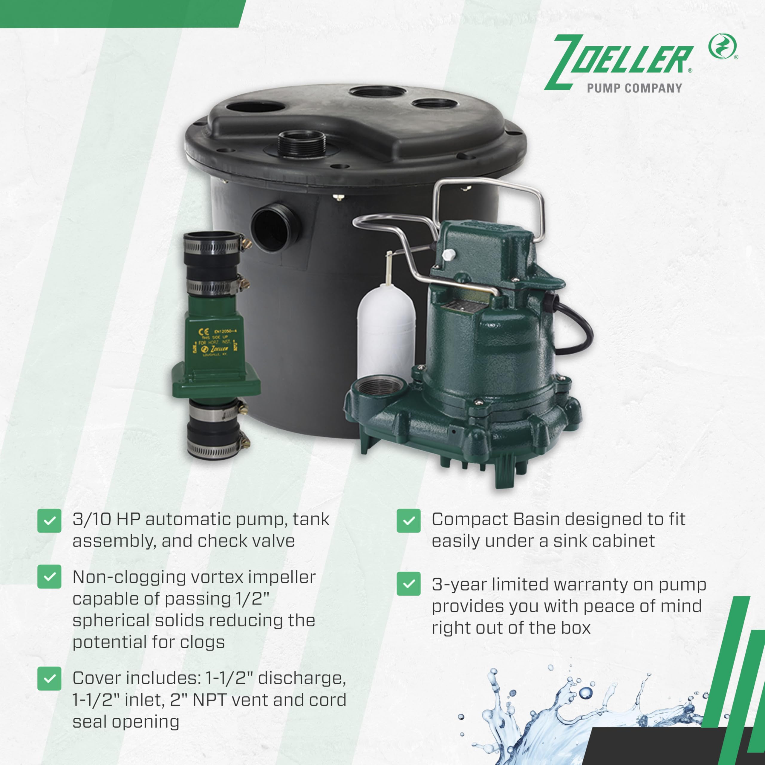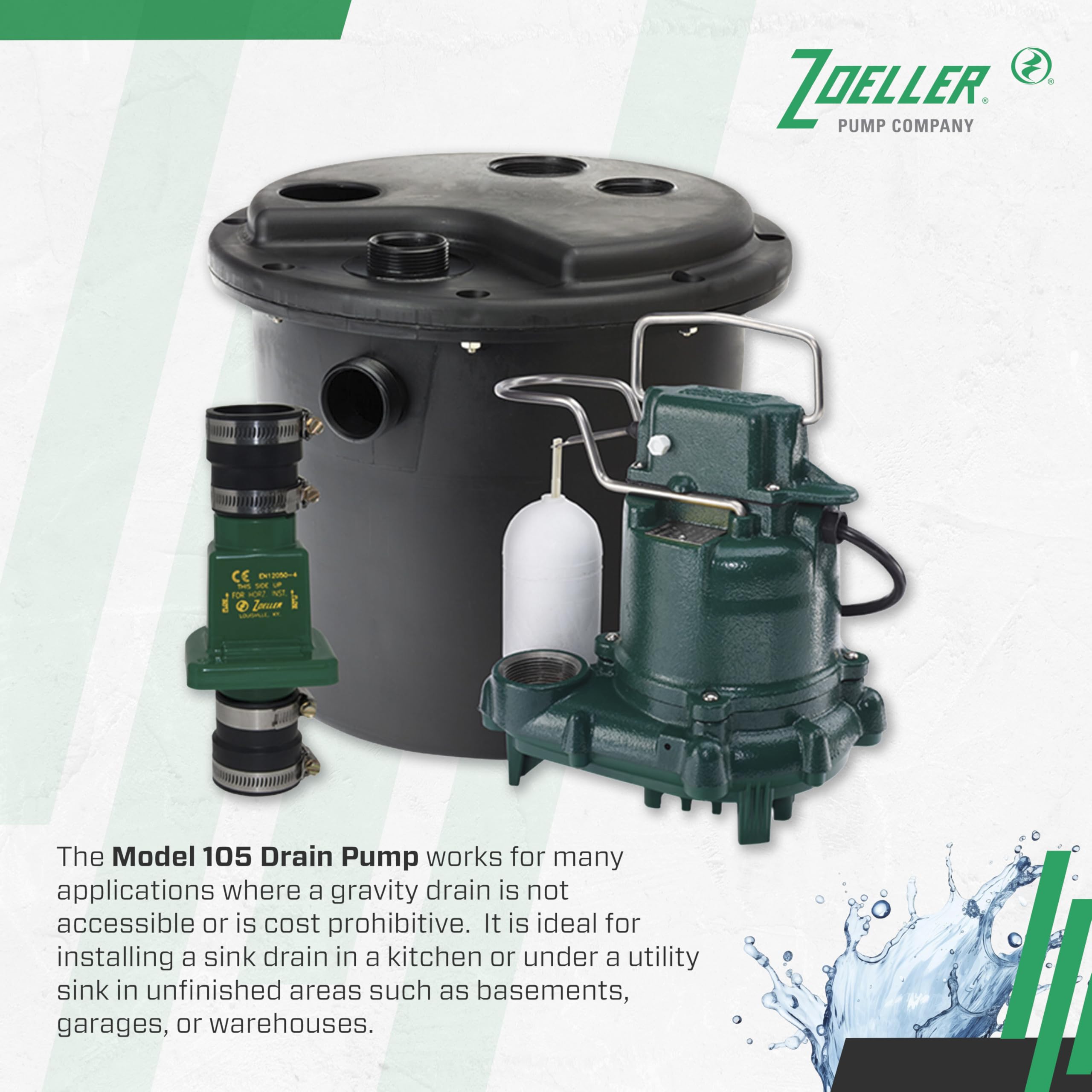 Effortlessly install the Zoeller 105‑0001 under a sink or utility sink, in basements, garages, wet bars, or laundry rooms without breaking concrete to add a drain