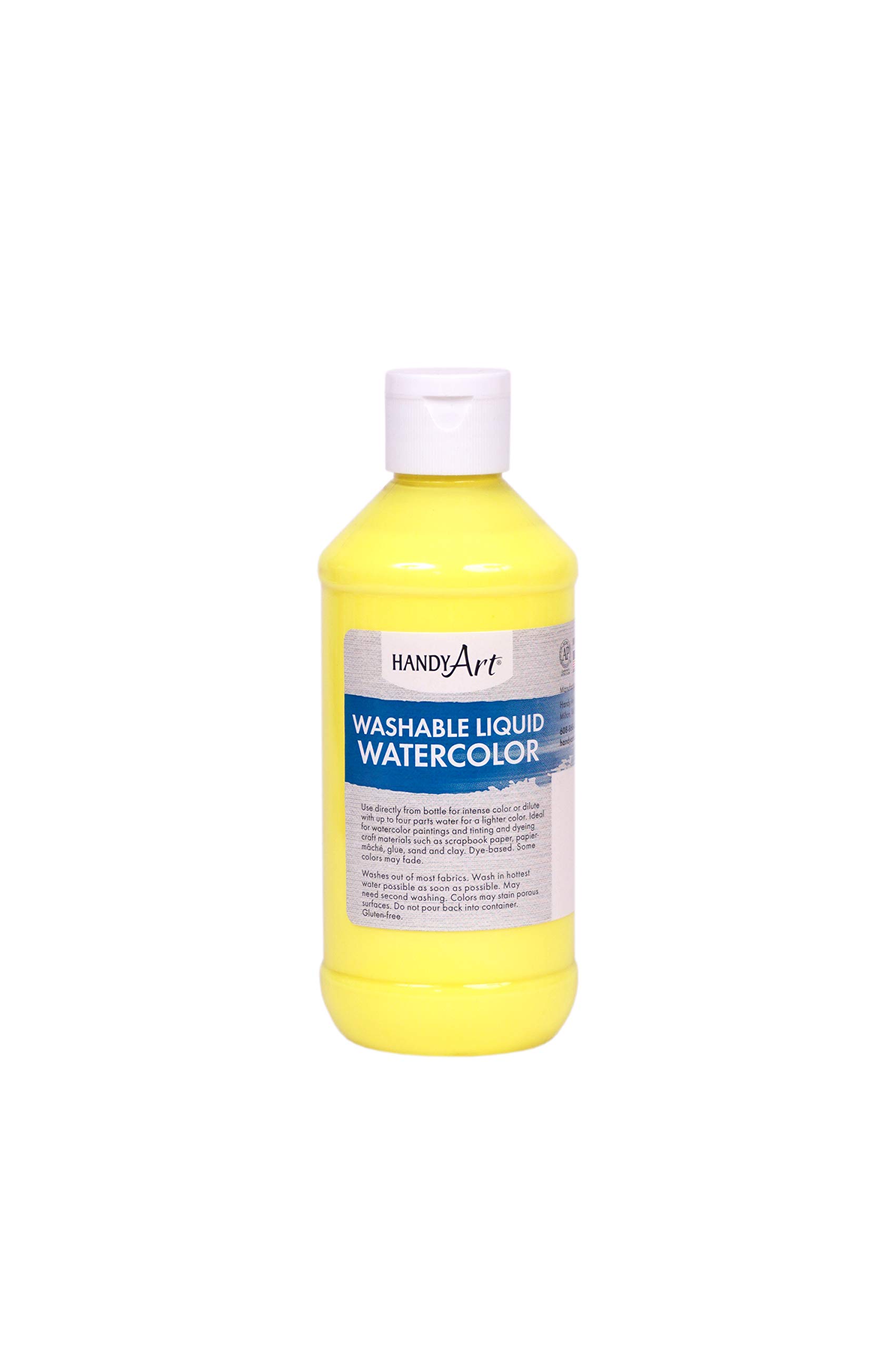 Explore the layers of the watercolor world with Handy Art Washable Liquid Watercolors. These vivid watercolors are concentrated liquid dyes that can be used directly from the bottle for intense color or diluted with up to four parts water to achieve a lighter color. Ideal for watercolor paintings and tinting and dyeing craft materials such as scrapbook paper, papier-mâché, glue, sand, clay and other projects. Washes out of most fabrics with soap and hot water. Certified AP Non-Toxic. Made in the USA.