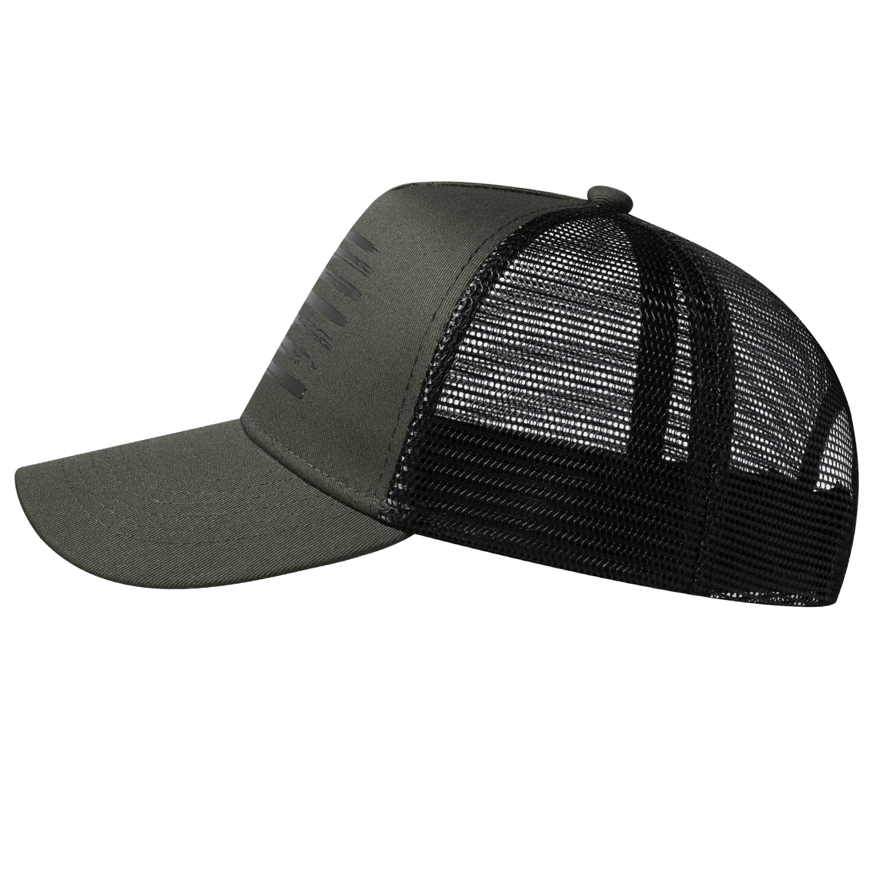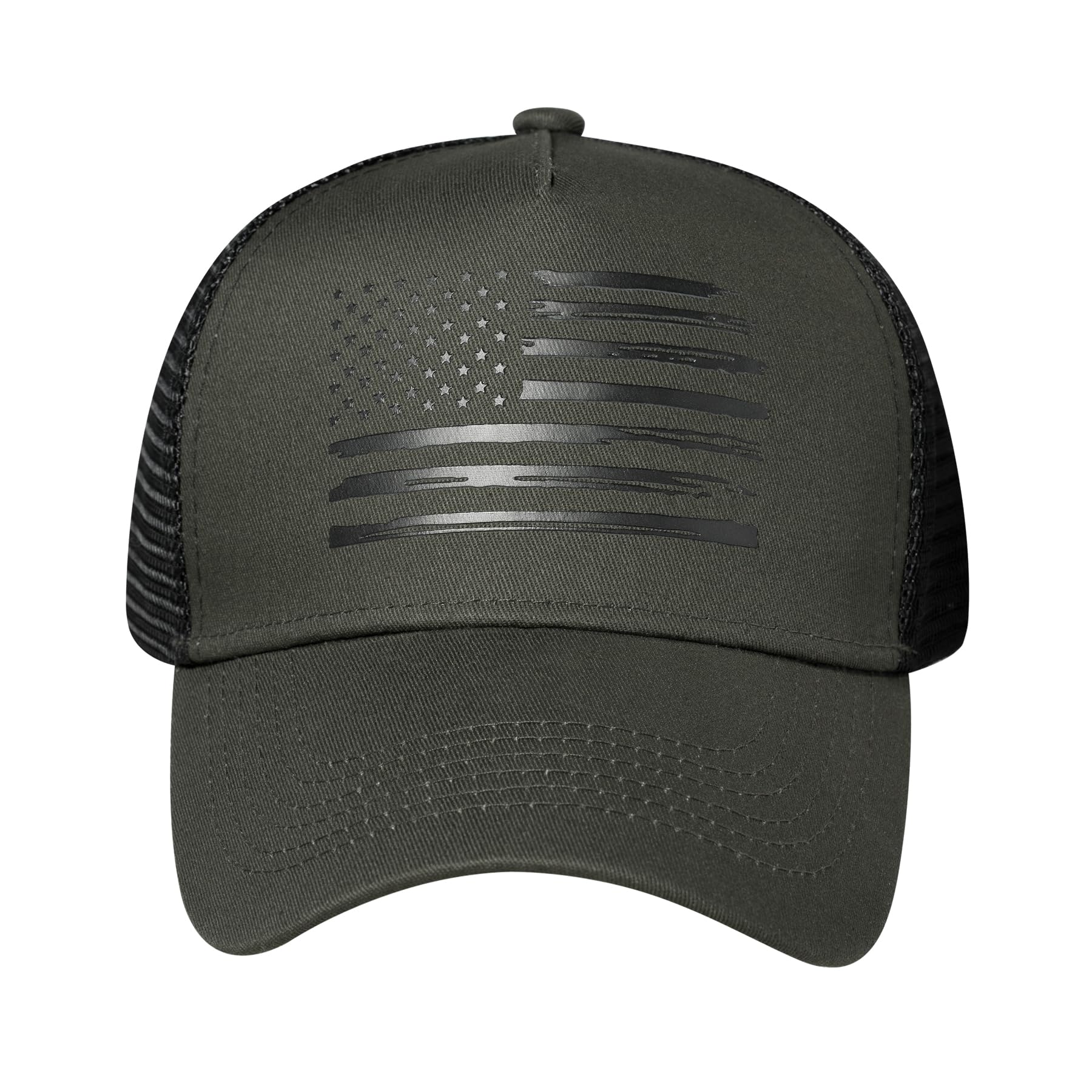 Versatile Style: Classic 5-panel trucker hat design, boasts precision - stitched seams that enhance its a well - contoured brim that retains its shape. Features a stylish distressed American flag graphic printed on the front panel, showcases the unique design of the baseball cap