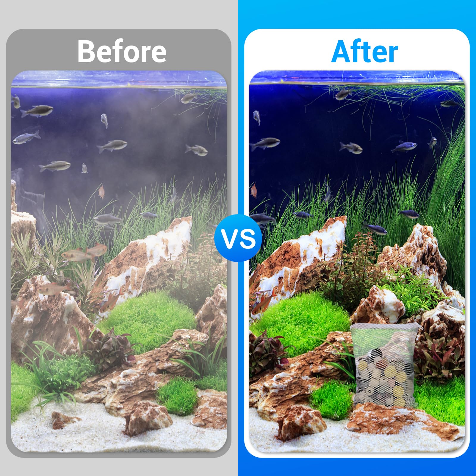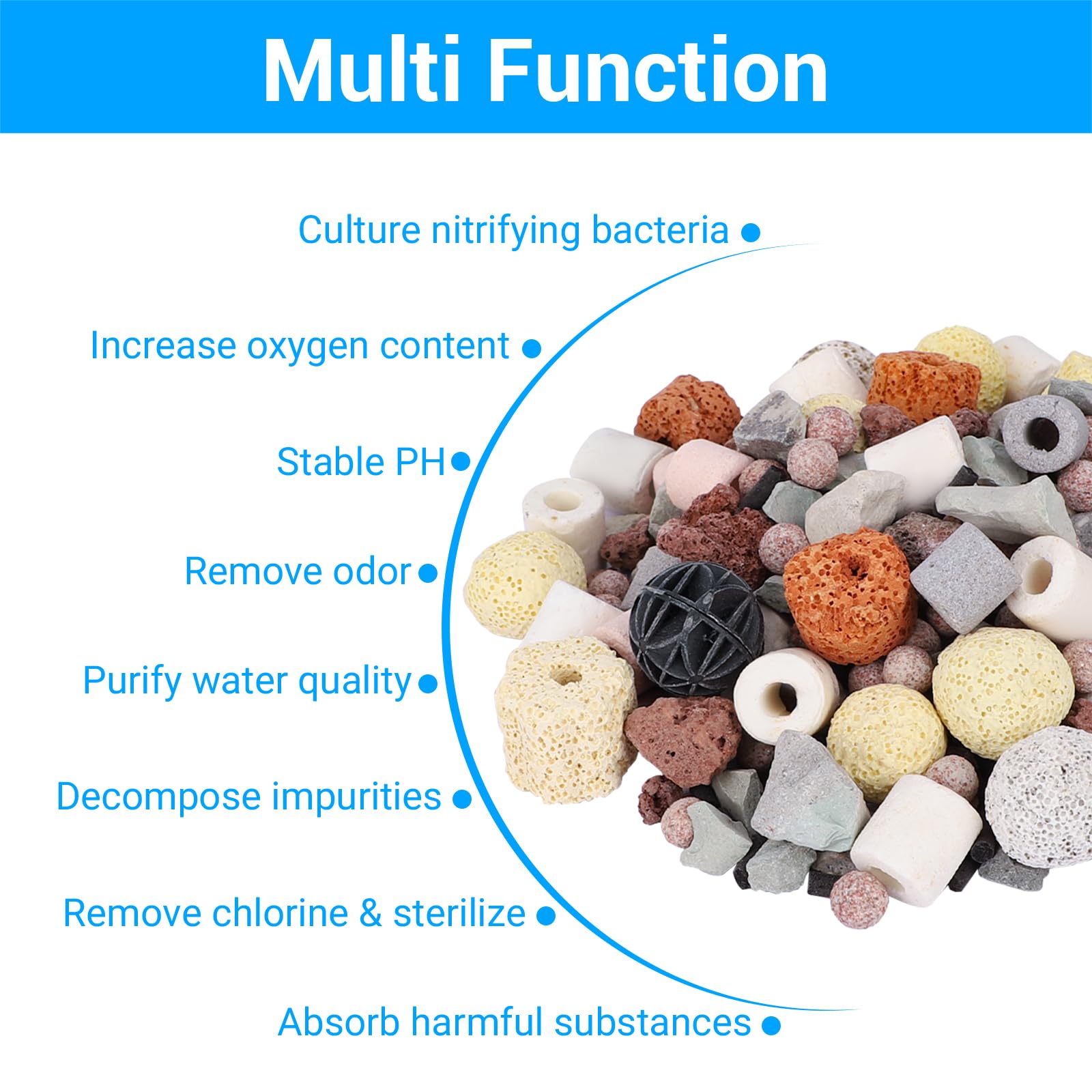 Multi Function: Our aquarium filter media not only cultures nitrifying bacteria, increases oxygen content, stabilizes pH, and removes odors, but it also works well in removing chlorine and sterilizing the water, purifying water quality, adsorbing harmful substances, and decomposing impurities. They help maintain a healthy and thriving aquarium.