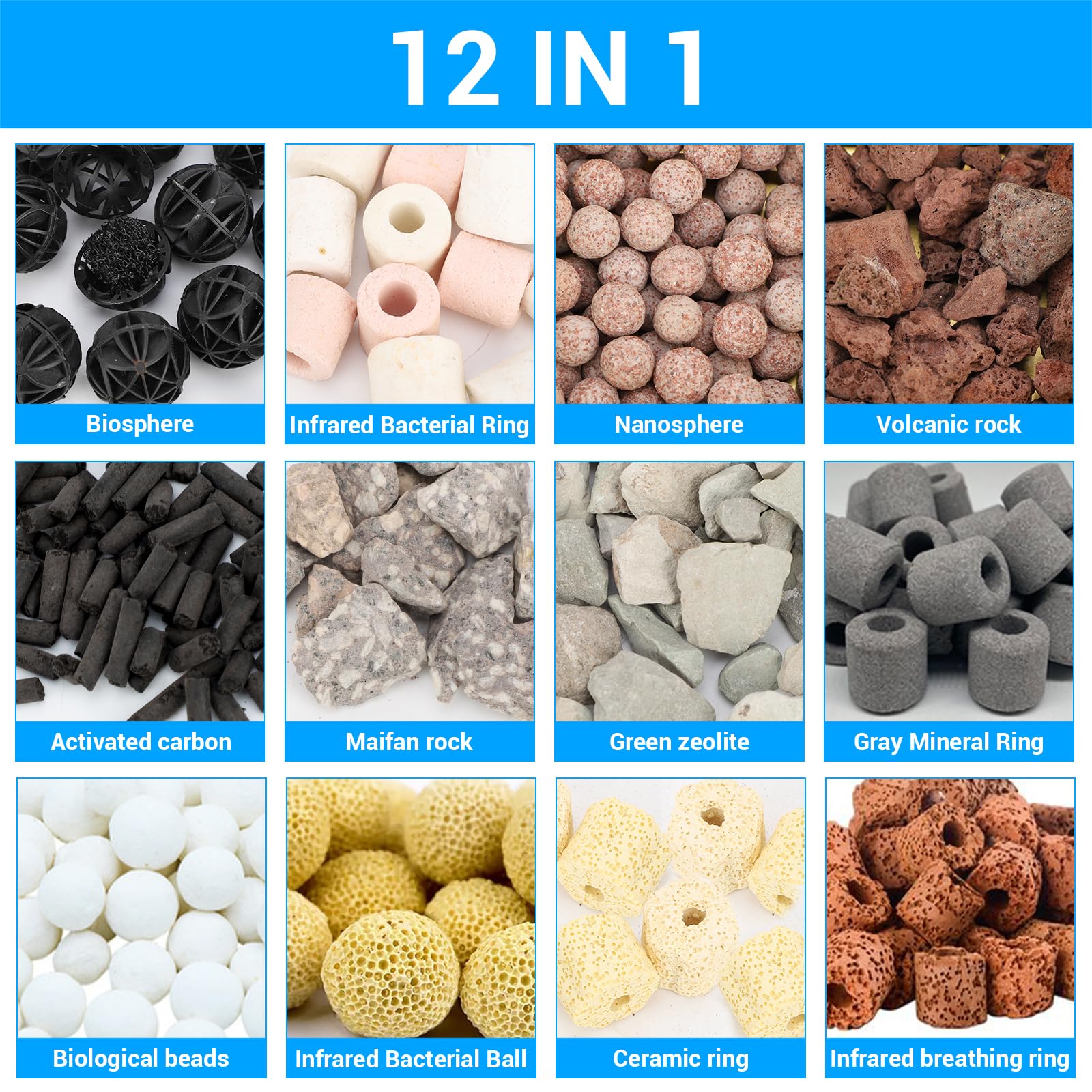 Nice Variety of Filter Media: You will receive a package of 12 kinds of aquarium filter media including ceramic ring, biological beads, activated carbon, maifan rock, infrared breathing ring, infrared bacterial ring, volcanic rock, green zeolite, nanosphere, biosphere, gray mineral ring and infrared bacterial ball. 2 pack in total, each pack contains 1.1lbs filter media. They are made of porous materials that can help keep our aquarium clean.