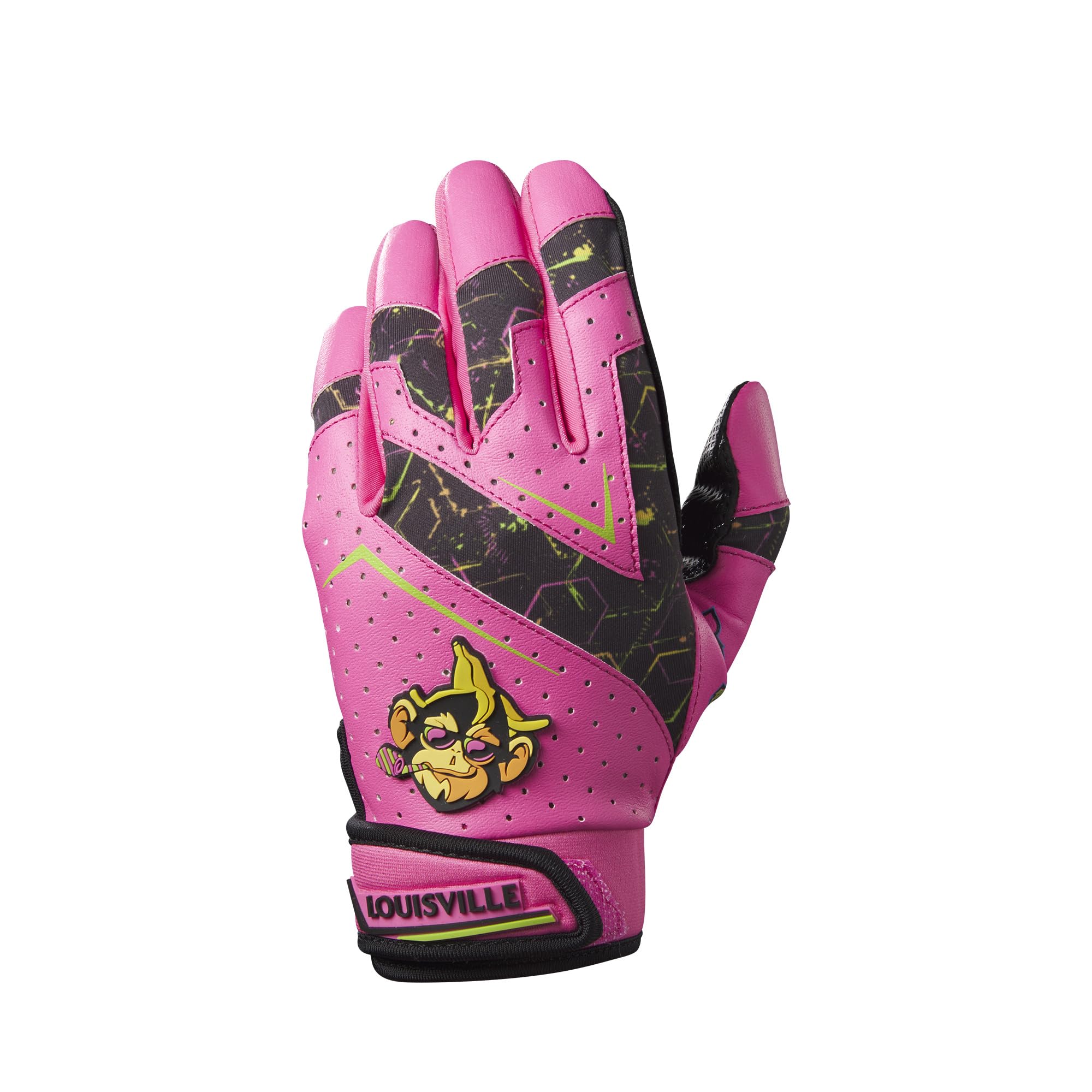 Buckle up and get the party started with the Louisville Slugger Party Animals Genuine V2, youth batting gloves inspired by the Savannah Bananas’ biggest rivals. Engineered for the rigors of Banana Ball, these Pink and Black baseball & softball batting gloves offer comfort and durability with a synthetic palm, perforated backhand and adjustable neoprene cuff.