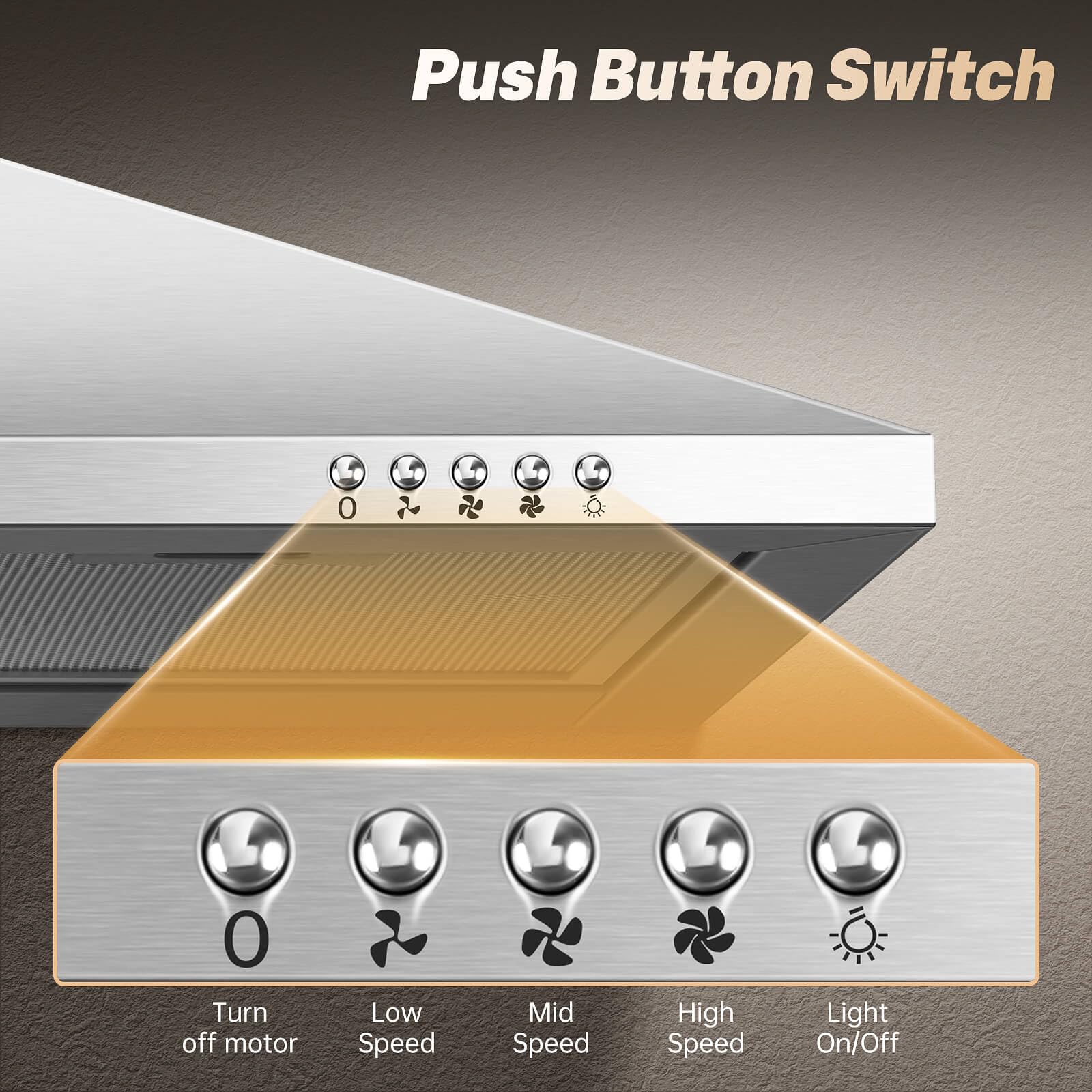 【Premium Stainless Steel Kitchen Exhaust Hood】Crafted from rust-resistant stainless steel, this stove vent hood features a brushed finish for easy cleaning. Comes with a 3-prong plug (110-120V/60Hz) for plug-and-play installation—no hardwiring needed. Tip: Remove protective film before use