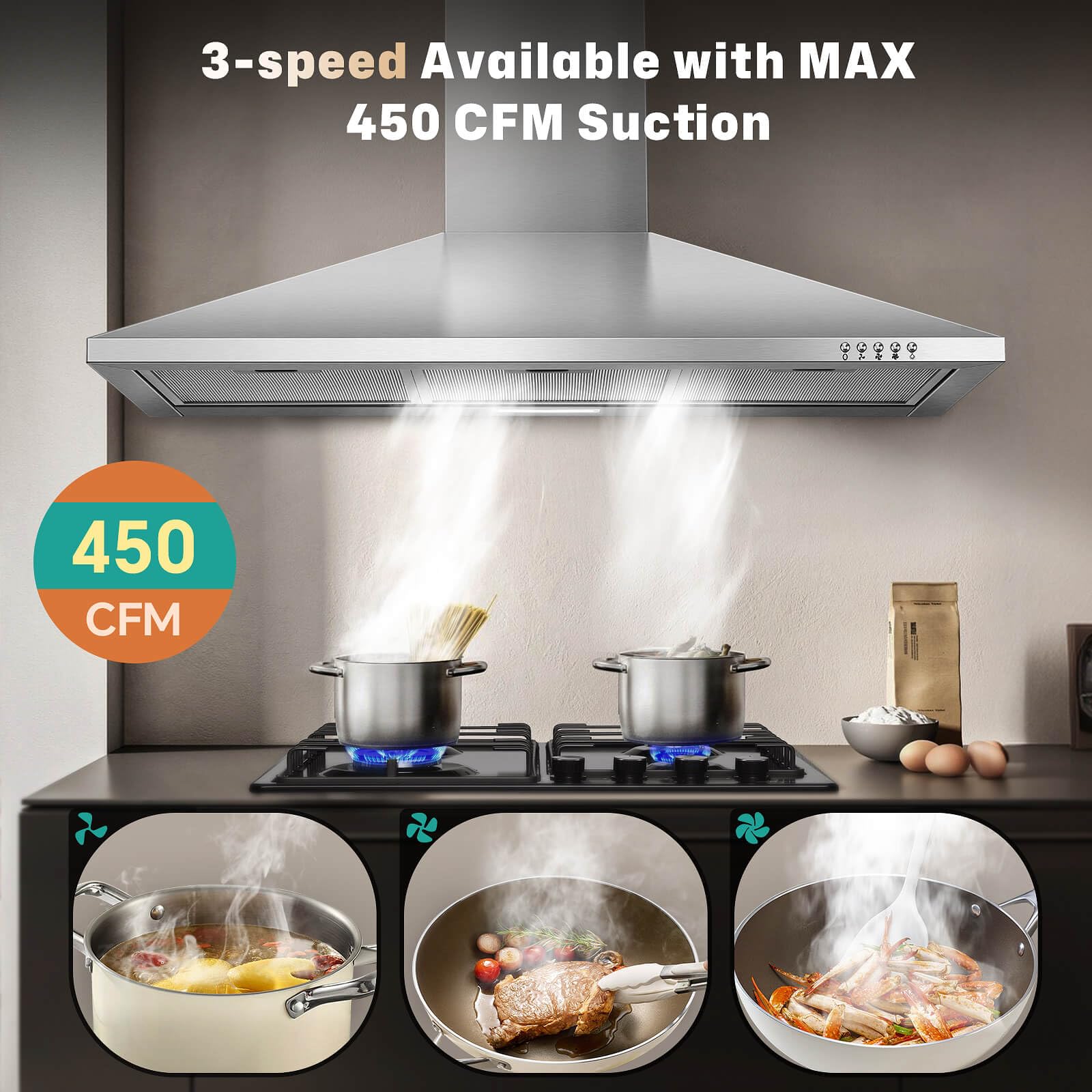 【450 CFM Powerful Suction & Quiet 3-Speed Fan】The 3-speed exhaust fan delivers 450 CFM suction power, efficiently removing smoke and odors while operating under 55dB. Perfect for frying, grilling, or boiling without noise disturbance