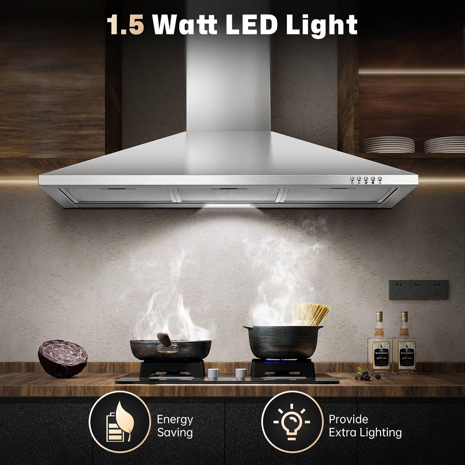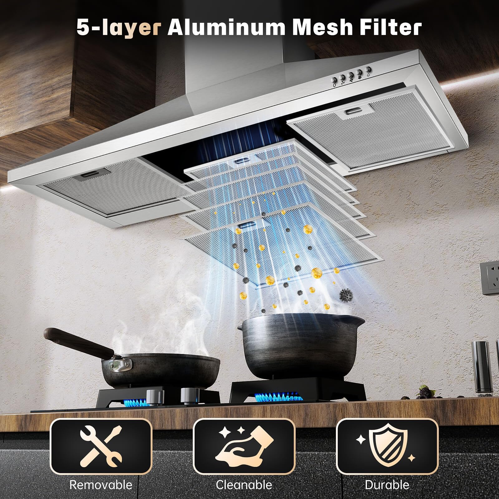 【User-Friendly Kitchen Vent Hood】 ✔ Bright LED lighting – Illuminates your stove hood workspace ✔ 5-layer aluminum mesh filters – Traps grease effectively ✔ Push-button controls – Easily adjust exhaust fan speed ✔ Adjustable chimney – Fits most kitchen vent hoods installations